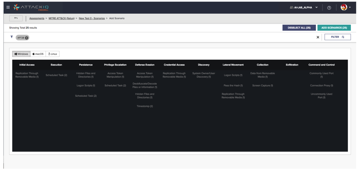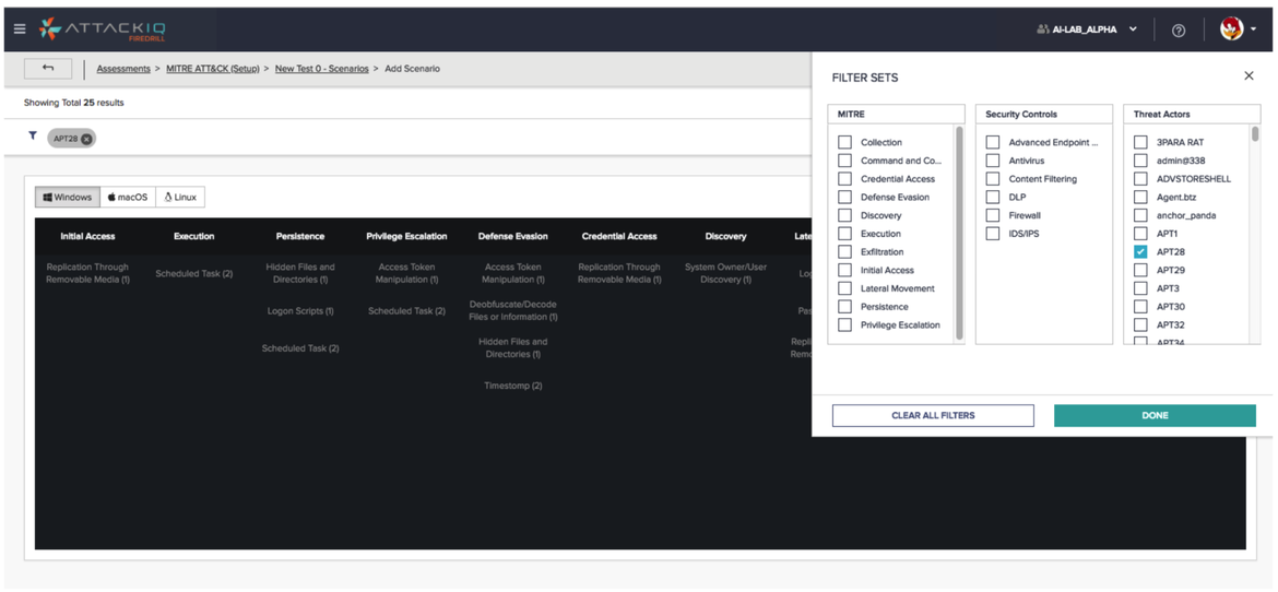 2) Select Scenarios using the MITRE ATT&CK Matrix using free text search or the predefined filters.