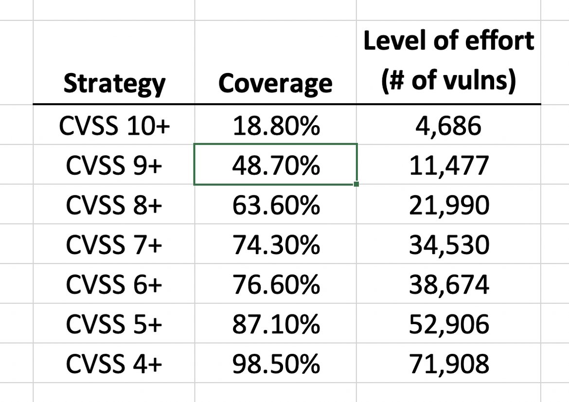 The table shows the coverage of the DHS strategy, where coverage is defined as the percentage of vulnerabilities that are patched relative to all the vulnerabilities that are known to be exploited in the wild. For example if there are 100 vulnerabilities that have been exploited and a particular strategy calls for 20 to be patched, then the coverage is 20%. For the data-set used in the study, the CVSS 9+ strategy provides a coverage of 48.7%, whereas the CVSS 7+ strategy results in close to 75% coverage. Note that the latter requires a large number of vulnerabilities (34.5K out of the 76K in the data-set) to be patched which can end up becoming a significant effort for a large enterprise.