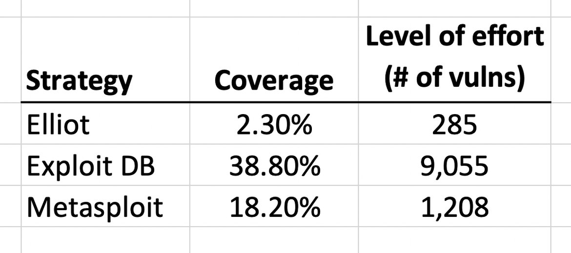 The numbers get even more prohibitive if you need to patch lower severity CVSS, as the Payment Card Industry Data Security Standard (PCI-DSS) requires. This begs the question of whether there is a more efficient way to prioritize vulnerability patching. It turns out that there is a significant correlation of real world attacks with vulnerabilities that have published exploits. The authors examine three major exploit frameworks, Elliot, Exploit DB and Metasploit to see if they are reasonable proxies for vulnerabilities that are exploited in the wild.