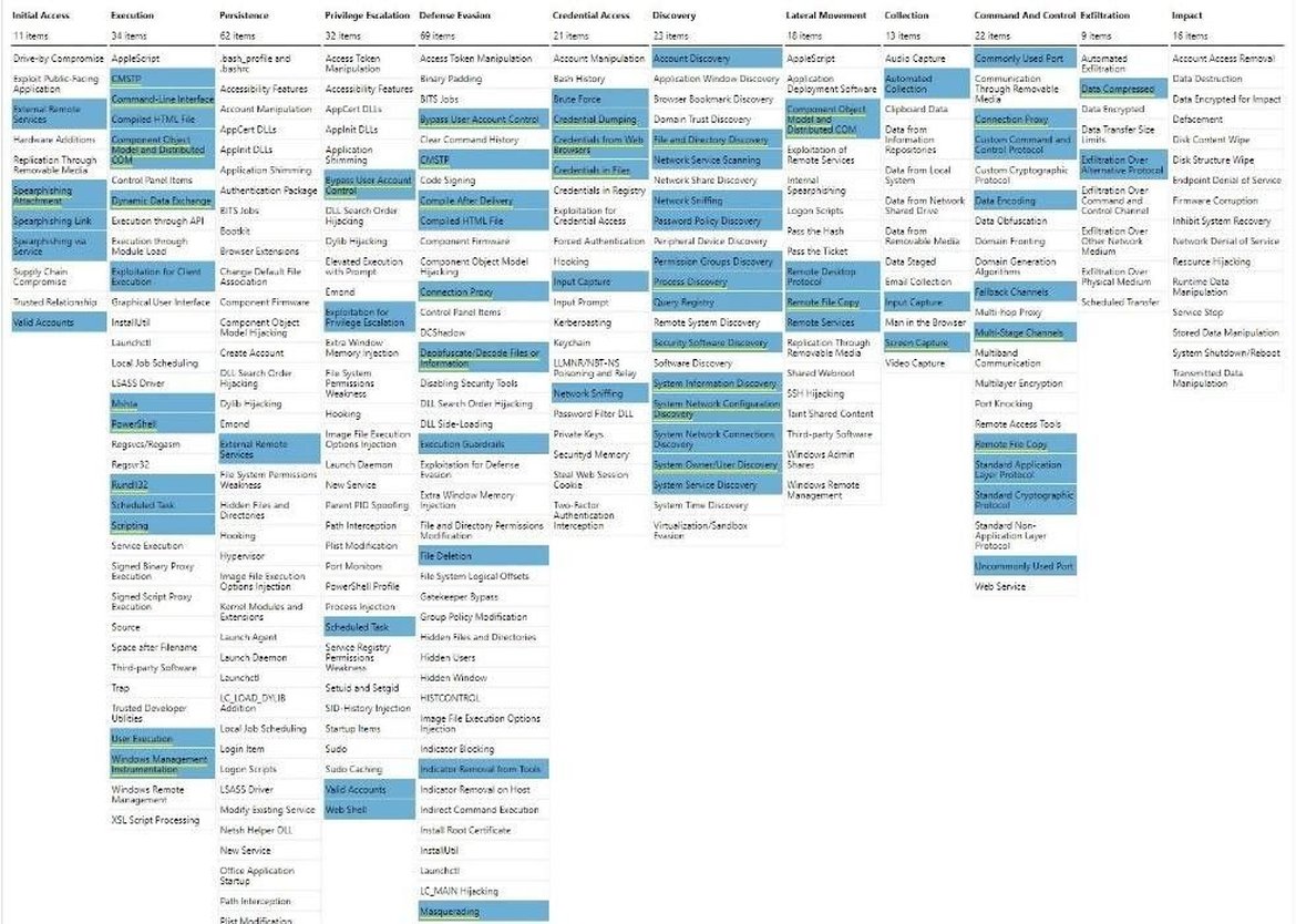 This map indicates all known techniques used by these actor groups. These are the techniques you’d likely be exposed to if your organization is attacked; therefore, you should focus on assuring you can defend against them. This will inform the preventive and detective controls that you will need to adequately protect yourself from known behaviors of Iranian hackers.