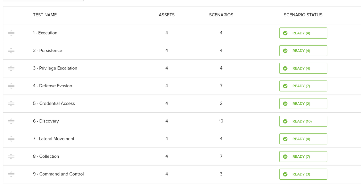 But how are these scenarios organized, and why? We decided to group them in 9 different tests according to their MITRE ATT&CK tactic, except for the last test where we decided to group the scenarios belonging to either Command and Control or Exfiltration tactics. In our case, the order of the tests corresponds to their position inside the MITRE ATT&CK matrix which, roughly speaking, corresponds to the depth of the intrusion after the initial breach.