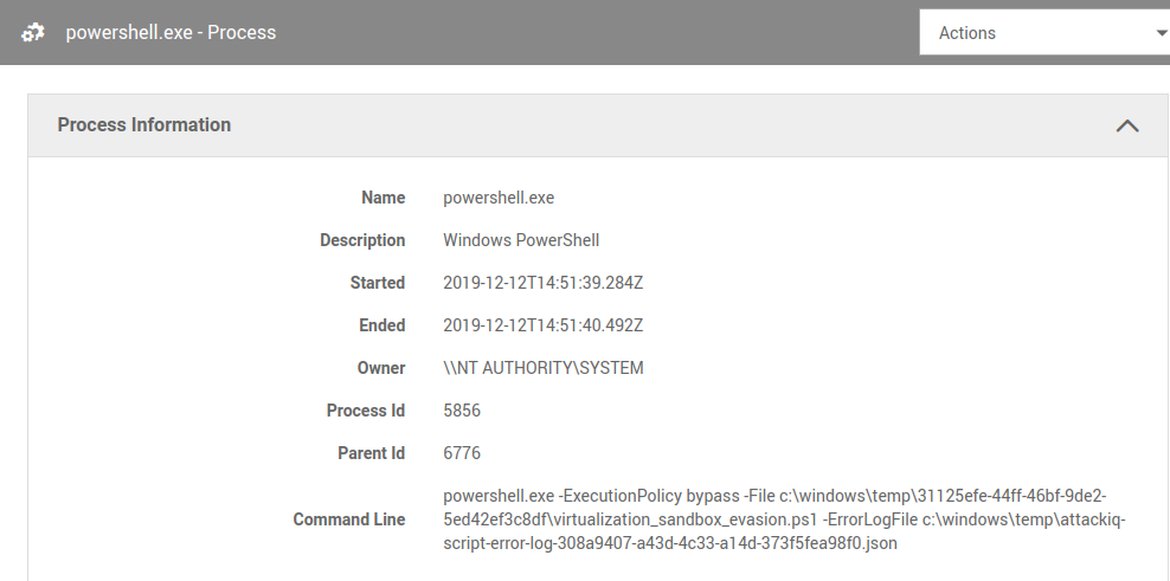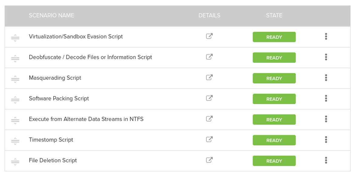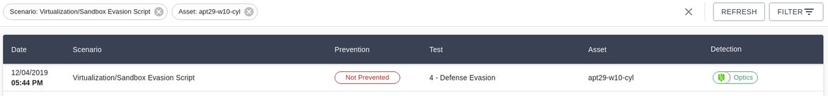 If you want a closer look to determine what worked as expected and what did not, it’s time to go to the Results section. There you will find the prevention and detection outcomes broken down for each scenario and asset. If so much data is overwhelming, be sure to check out the filtering options to only display the results for a specific asset (or group of assets, like the high- or low-value assets), test, or scenario that you are interested in. For instance, in the following screenshot, we filtered the results by the Virtualization/Sandbox Evasion Script scenario for a particular asset, and we see that it is detected by CylanceOPTICS: