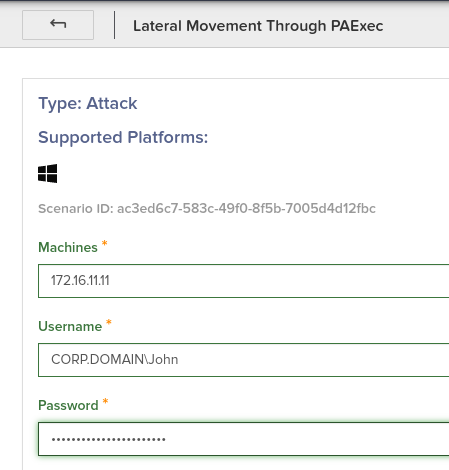 One such example is the Lateral Movement test, specifically the scenarios “Lateral Movement through PAExec” and “Lateral Movement through WinRM”. The first scenario will need a list of target machines, as well as valid credentials for these machines, to effectively perform the lateral movement. A similar case is the Lateral Movement through WinRM, although it does not need the list of target machines (since by default it will do a network scan to determine the possible targets), we recommend giving specific IPs to avoid waiting the time that this network scan needs to complete across that target network. This scenario will also need valid credentials for the target machines to be specified.