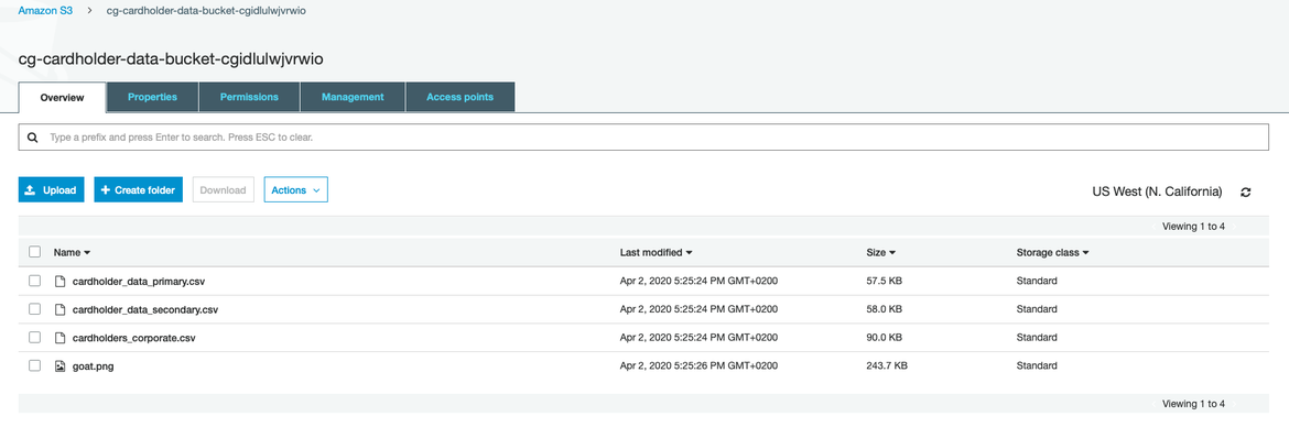 As you can see in the image below, we have created a bucket for testing purposes in an AWS account with some banking information stored in CSV files and some innocuous files (goat.png).