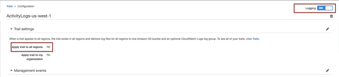Trails can be enabled in all regions, but in this example we are going to monitor only our region, which is “us-west-1”. Don’t forget to enable the trail setting “Logging”.