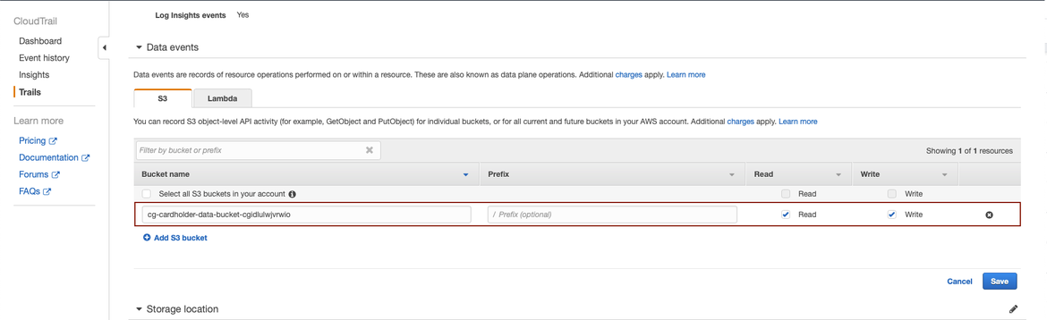 In the Data Events section, we will configure the trail to log any activity (read and write) happening in our targeted bucket (the one named “cg-cardholder-data-bucket-cgidlulwjvrwio”):