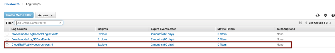 If the process is completed successfully, all access logs to our S3 bucket should be found in the CloudWatch service through the “Activity-Logs-us-west-1” Log Group: