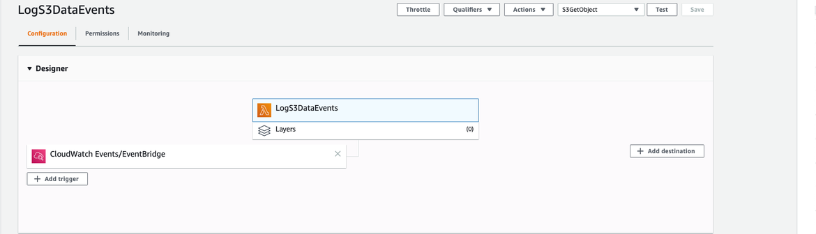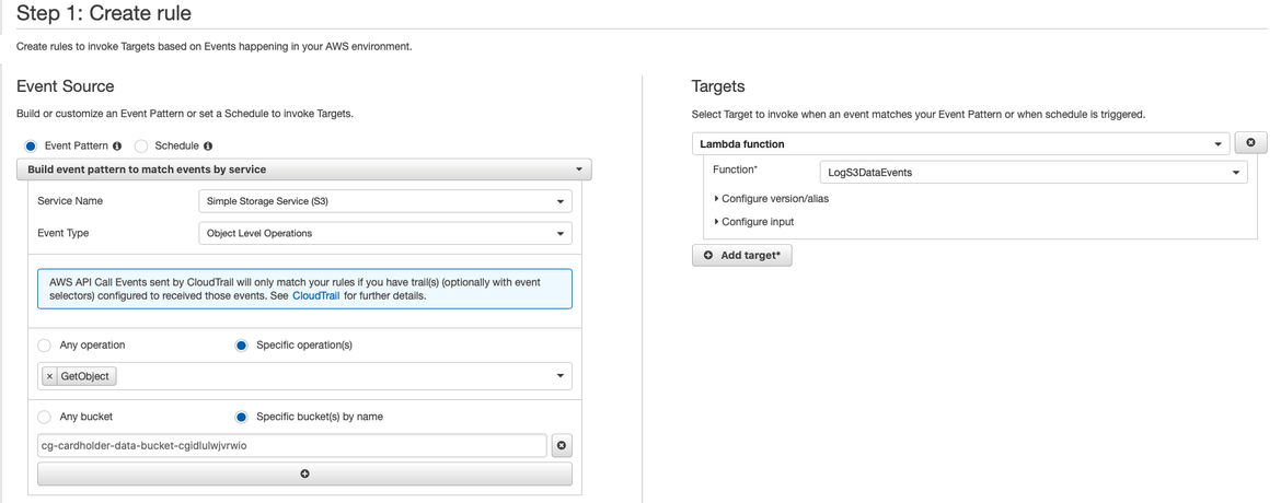 In a nutshell, we are going to create a rule to trigger a function call to a Lambda function called “LogS3DataEvents” every time a “GetObject” event is raised in our bucket.