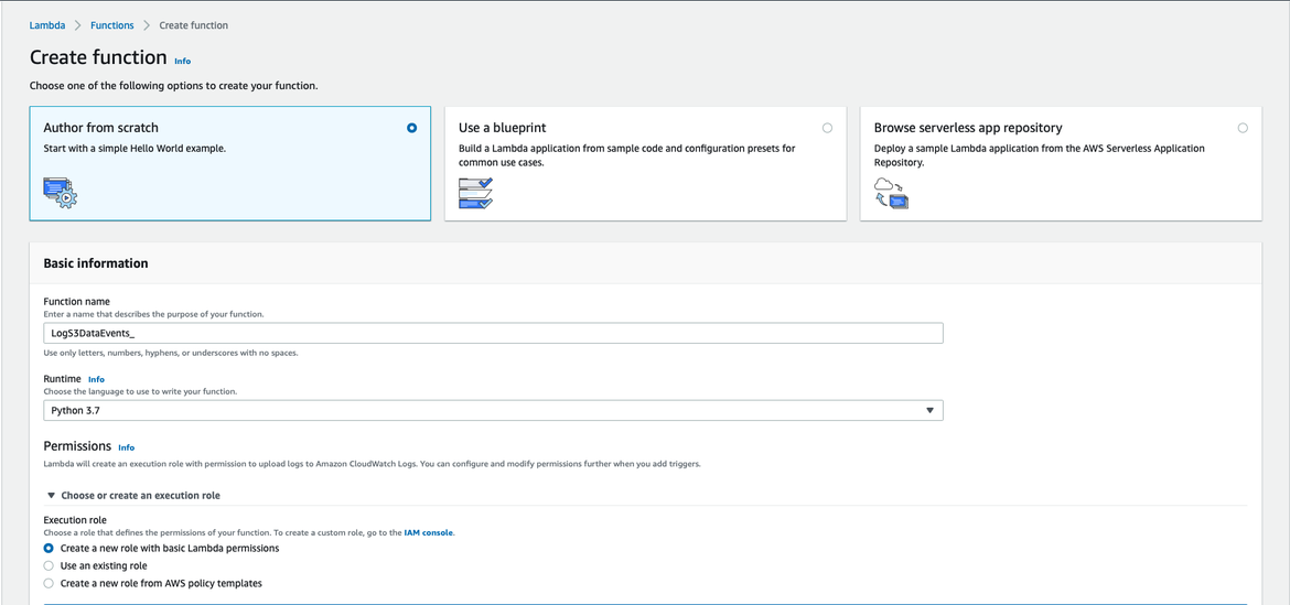 After all of the above, now is the time to create the Lambda function for processing the logs. You will need to go to the Lambda service and create a new function from scratch as it is shown below: