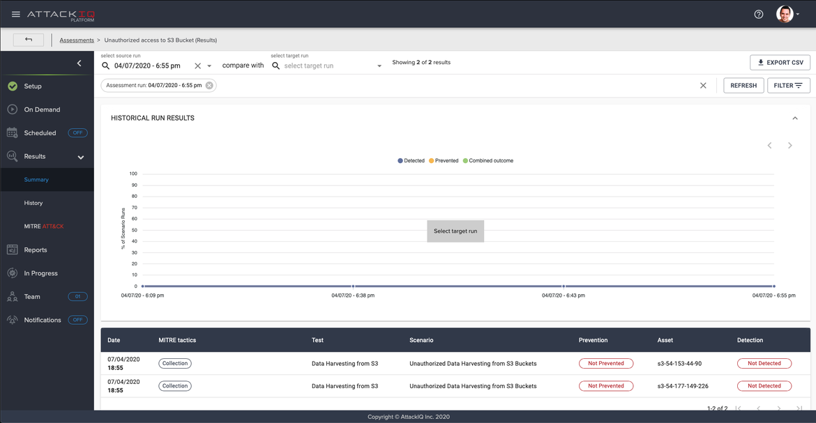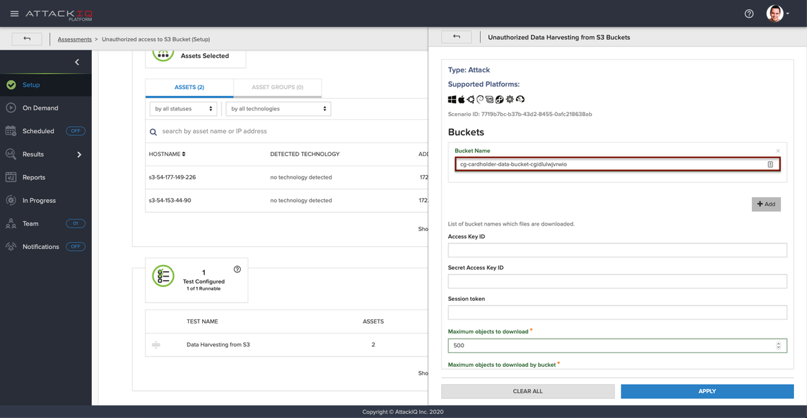 It is time to configure an assessment to test our implemented security mechanism. Using AttackIQ Firedrill, you can configure an assessment with the scenario called Unauthorized Data Harvesting from S3 Buckets to test if any unexpected access is happening in your monitored bucket.
