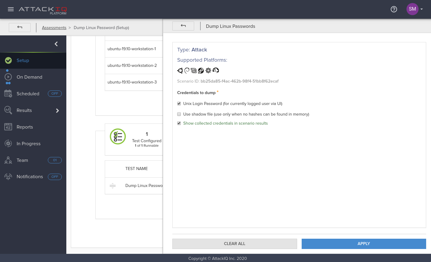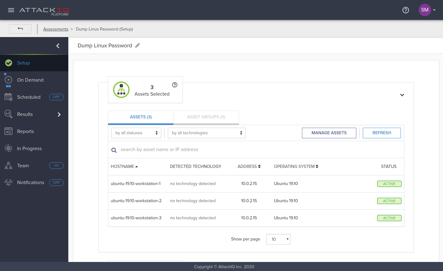 We created and configured a custom assessment for running the newly created scenario on three different assets. Those Assets are running Ubuntu 19.10, simulating being the workstations that a given company might have. Please note that in a real scenario the list of assets would be much larger, and to that end, asset groups could be used.