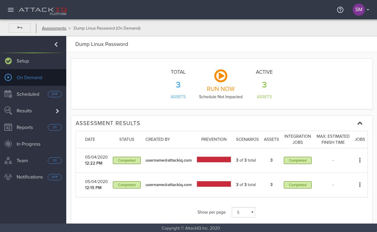 Once the assessment is created and populated, unless otherwise specified the user hits the “Run Now” button and the platform contacts all the selected assets to deliver their corresponding jobs. Each asset will run each of the configured scenarios, preserving the order they had when they were added into a test.