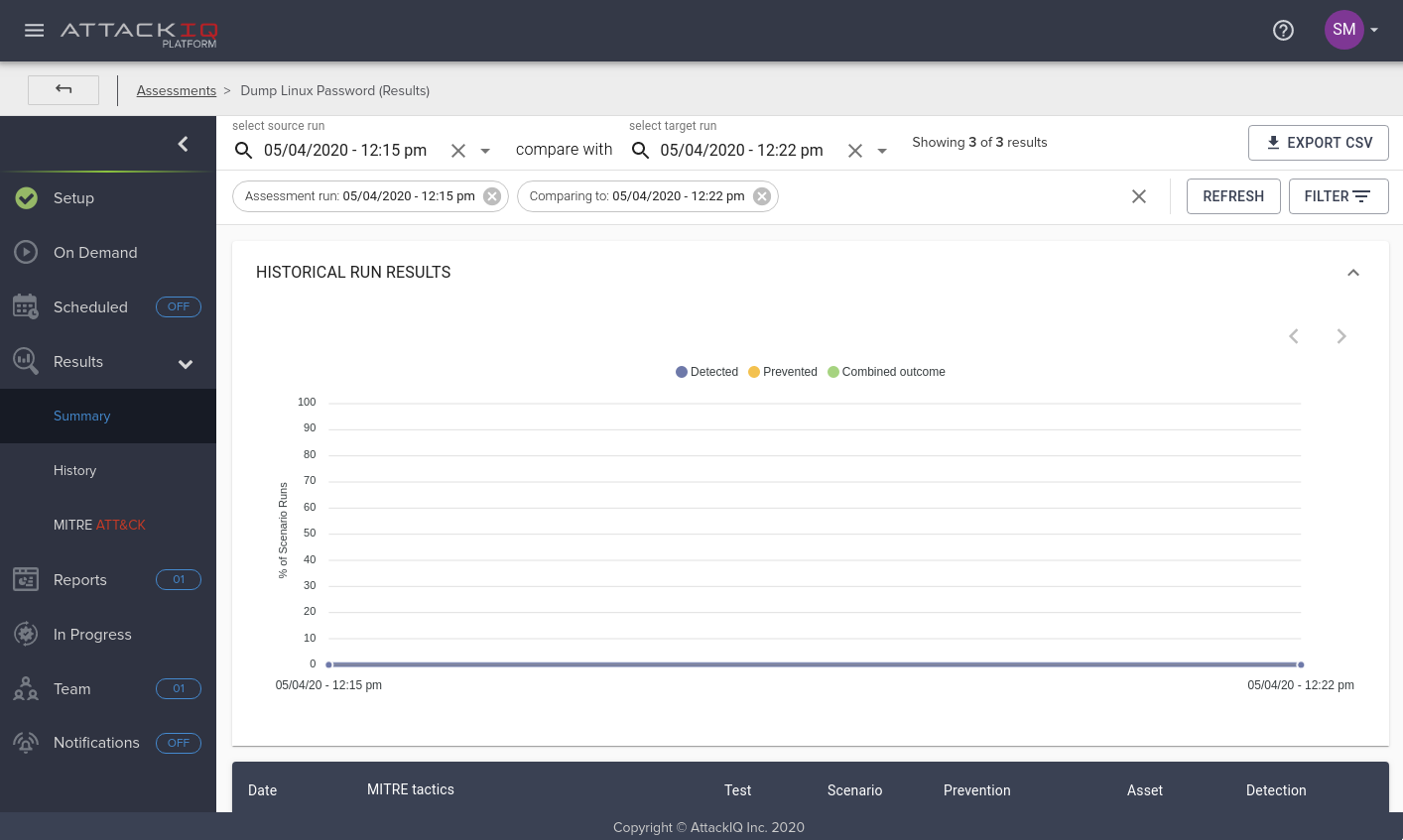 The AttackIQ platform provides insights on the results of assessment executions at different levels, with different levels of detail. As an example of aggregated results visualization, the summary results view provides a graph that shows the evolution of detections and preventions for that particular assessment, if it has been run multiple times. (In the screenshot below we can see that there were no detections on the two runs we did.) This view can help check whether the security posture regarding the tested scenarios is evolving positively or negatively.