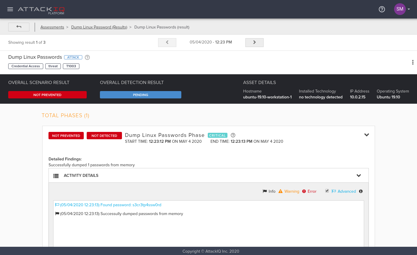 In the scenario we described in the first post in this series, in which the attacker dumped the user login password in GNU/Linux, we can even see the password retrieved. As we saw before, showing the retrieved password is an option that we included in the scenario configuration, meaning that if we unchecked that option in the scenario parameters, the password would be redacted.