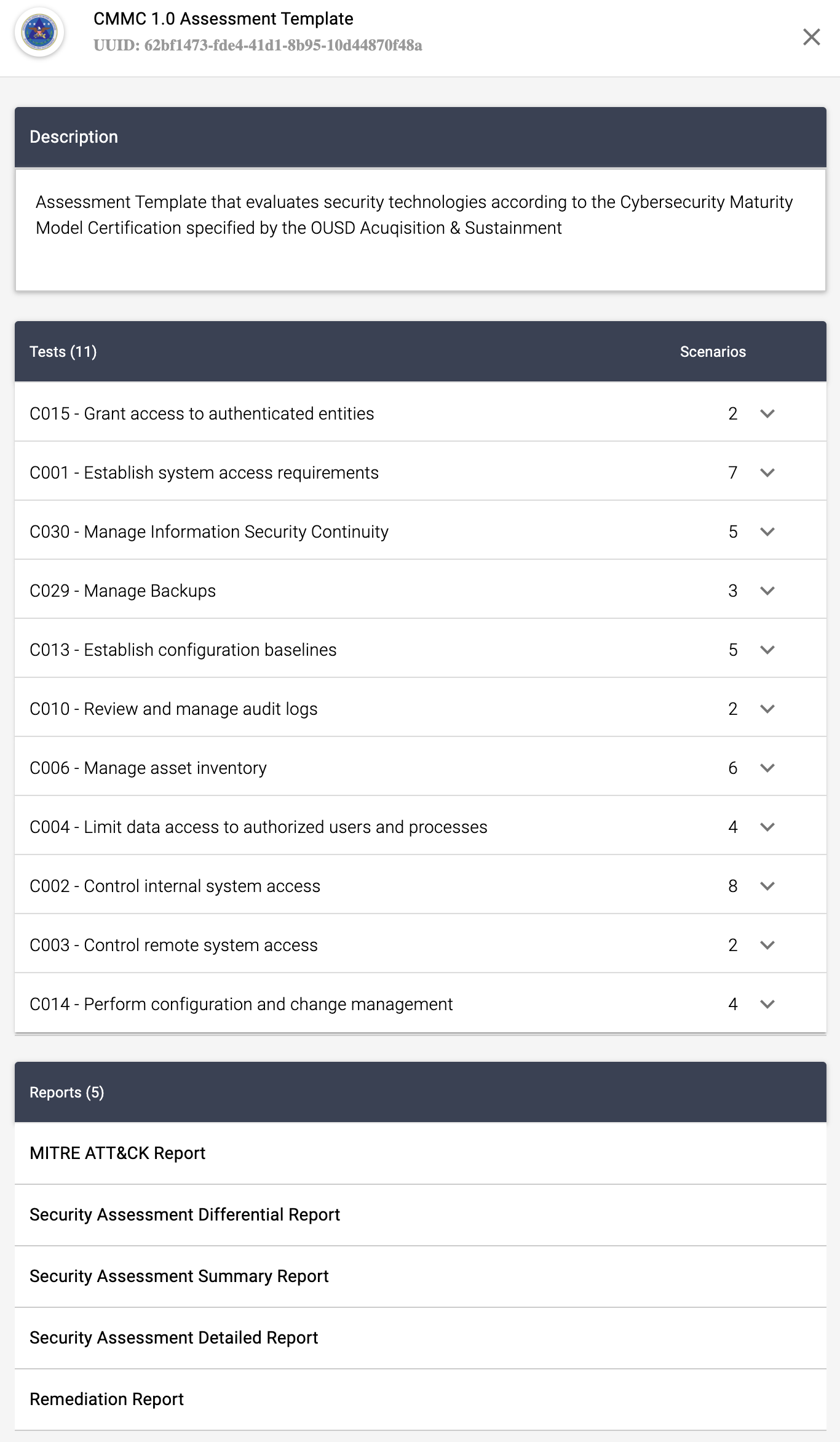 Here is an image of an Assessment Template showing MITRE ATT&CK Tactics and associated Scenarios in the Security Optimization Platform that are ready to run on your security technologies as aligned to CMMC capabilities, listed on the left.