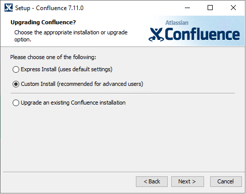 During the installation we used the default settings at every step, except for the installation directory which we changed to C:\Confluence in order to demonstrate the permission misconfiguration. This directory can be created through the installer GUI.