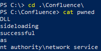 From here, restart the computer, or restart the Confluence service as an administrator. The payload contained in the DLL will then execute and the evidence of that can be found in the text file C:\Confluence\pwned.