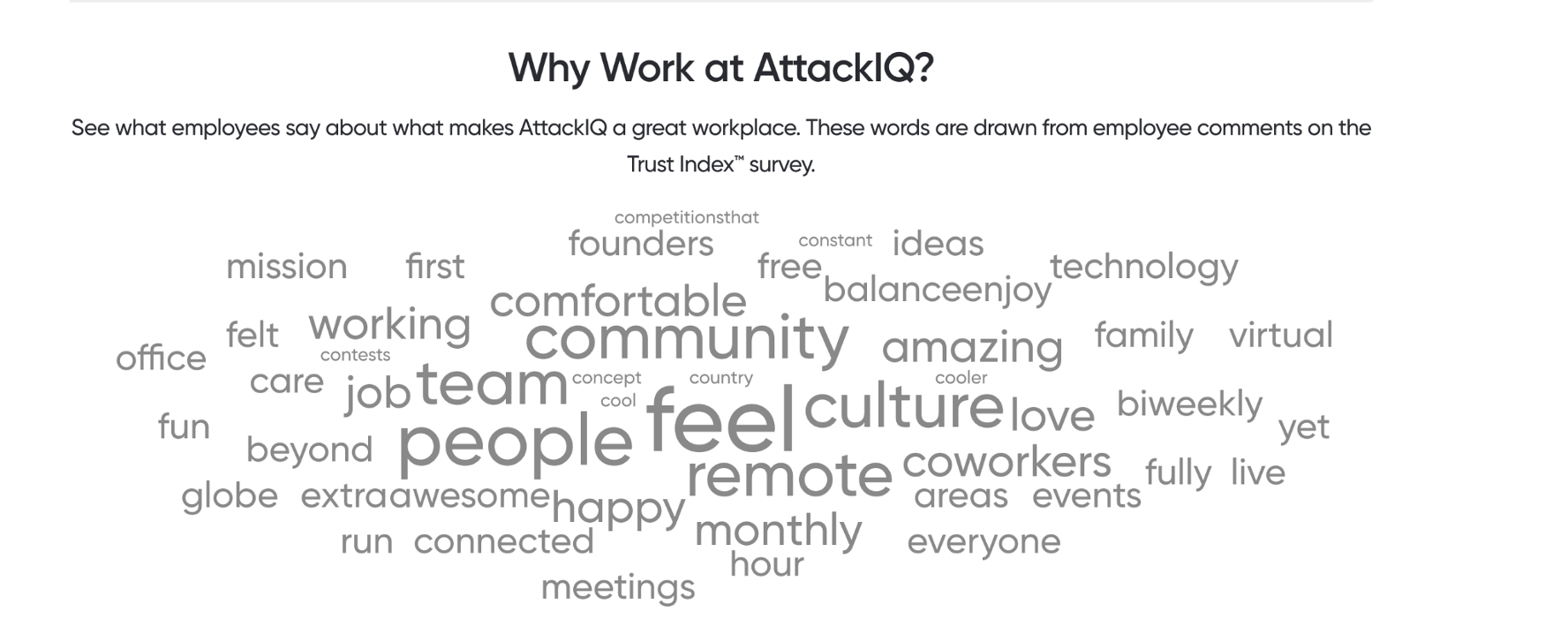 And the best part is what we hear our own employees saying. 91% of employees at AttackIQ say it’s a great place to work compared to 59% of employees at a typical U.S.-based company. 98% of employees said when you join you’re made to feel welcome. We see a reflection of the “one team” mentality we strive to uphold as a company value in our survey results as well. One survey participant summed up our culture of appreciation perfectly: “We trust each other, and there is a unique balance of respect and genuine kindness as professionals.” I personally feel wonderful to see things like, “comfortable,” “community,” “team,” and “happy” as terms associated with our organization in our survey word cloud. (And “extra-awesome” made me smile too!)