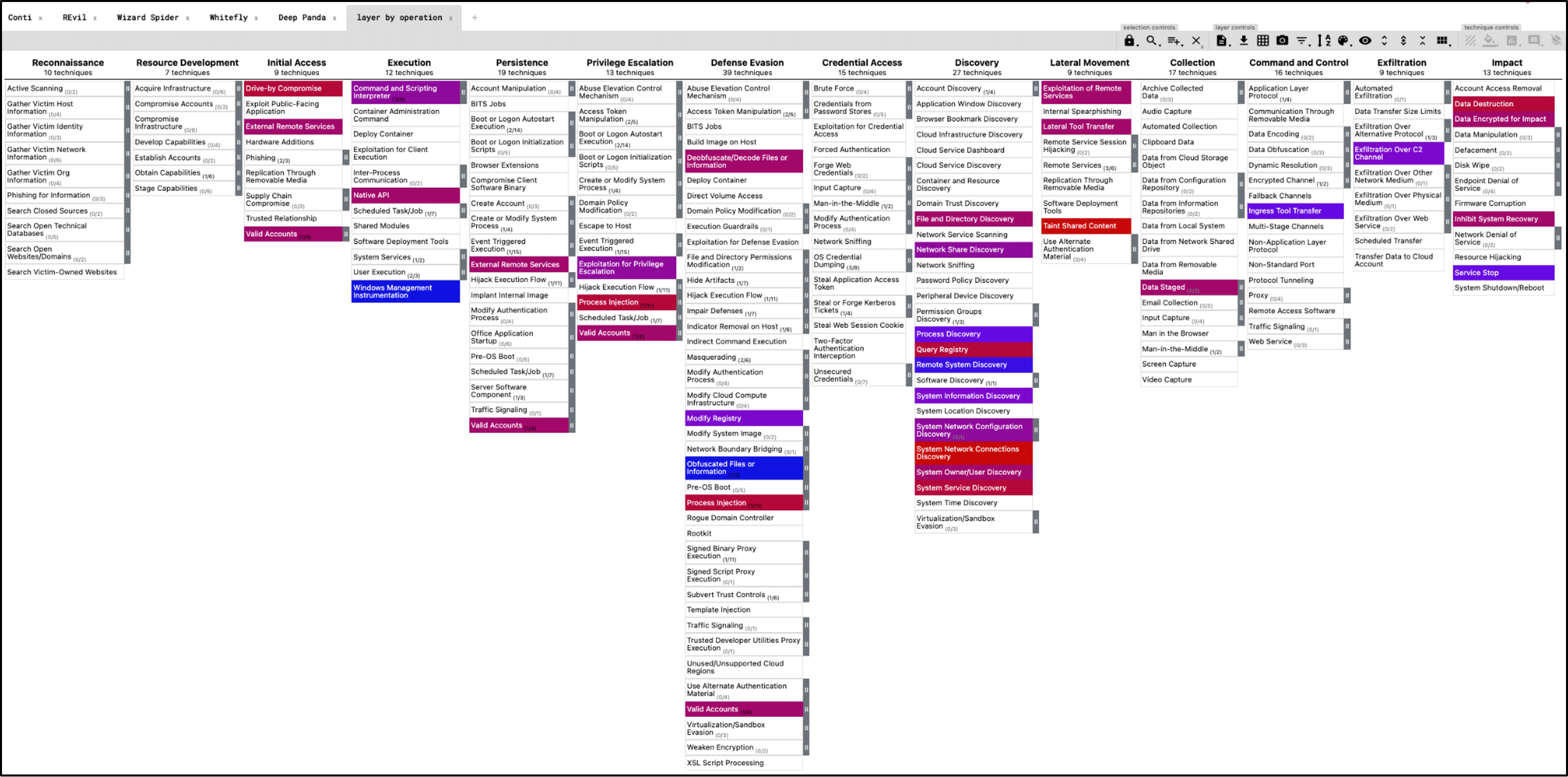 Shown below is an example of the tactics, techniques, and procedures (TTPs) used by Conti, REvil, Wizard Spider, Whitefly and Deep Panda. Of the five groups, there are a total of 31 techniques across 12 tactics (not including sub-techniques). Of course you can tailor this to individual groups or software of interest to you. Focusing on the groups, software, and TTPs that are more prevalent in the healthcare industry can help you understand your defenses and the capabilities that matter most to you. Exporting ATT&CK Navigator leads to a JSON file which you can then import into AttackIQ, giving you a whole host of scenarios specific to each tactic and technique.