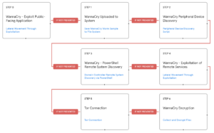 To dive a bit into the Anatomic Engine and the attack graph, let us look at the case of WannaCry cryptoworm, which since its first appearance in 2017 continues to spread and infect unpatched systems all over the world. It also has within it a range of MITRE ATT&CK techniques. The relevant attack graph (what some call an “attack flow”) in the AttackIQ Security Optimization Platform validates network and endpoint security control prevention and detection capabilities to thwart it. A high-level overview of the AttackIQ Security Optimization Platform’s emulation of this threat’s behavior is described below and shown in figure 1 and 2 below (pg. 18-19).