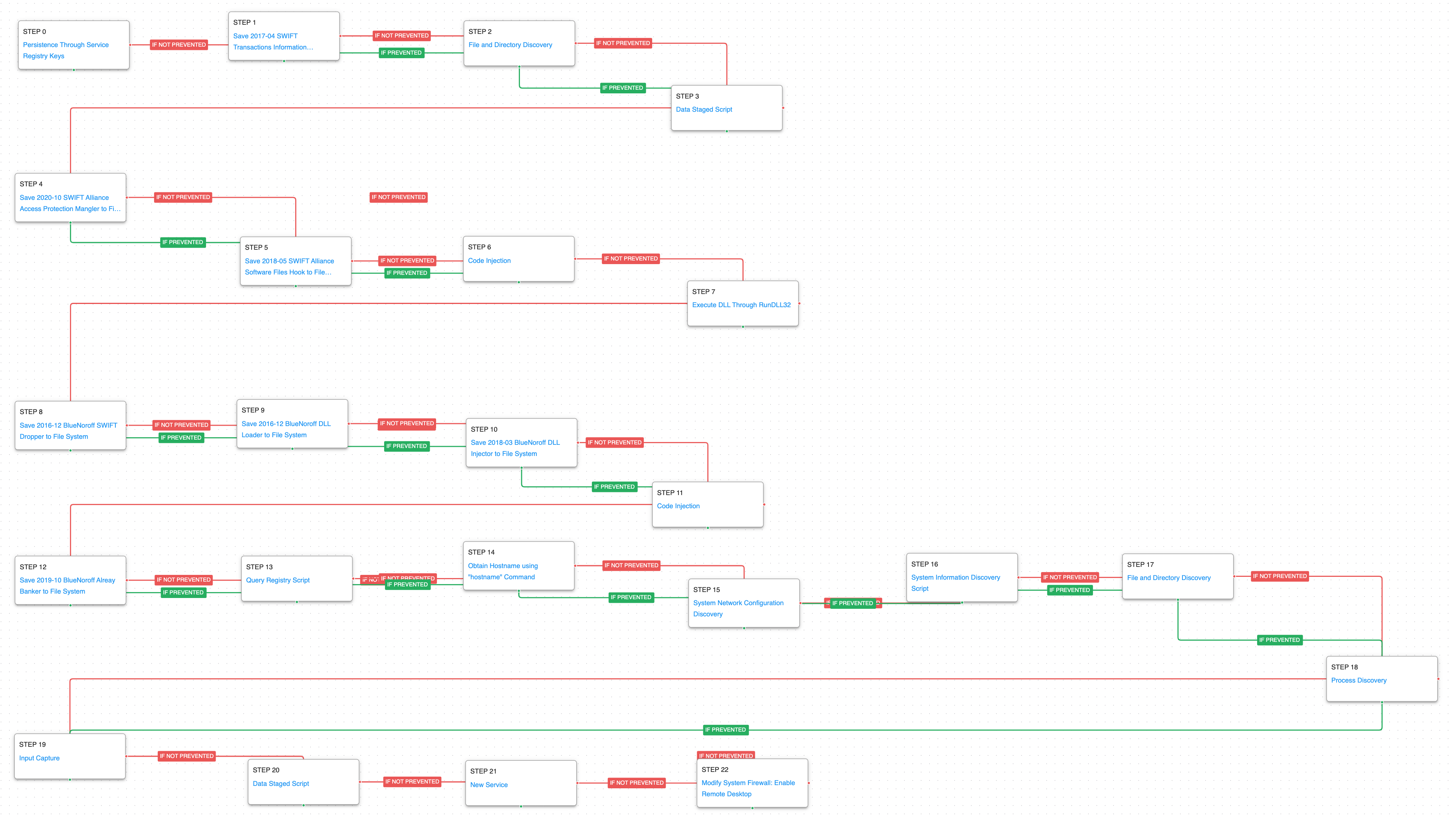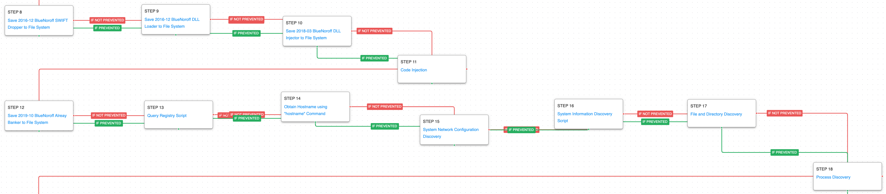 In October 2017 BlueNoroff attacked the Far Eastern International Bank (FEIB), a commercial firm in Taiwan, and attempted to move funds from accounts to multiple overseas beneficiaries. This attack graph emulates the activity observed during the attack against the bank starting with the delivery of their custom malware and the discovery techniques taken by the actor to understand the compromised environment. The final steps of the attack graph led to the deployment of a ransomware scenario that BlueNoroff used as part of a false flag operation to distance themselves from the true intent of the attack.