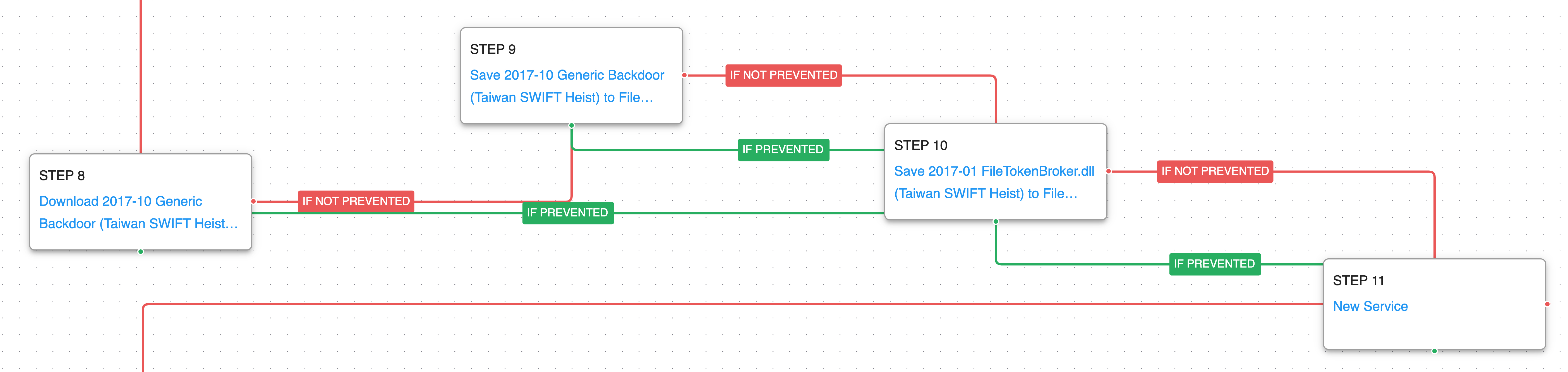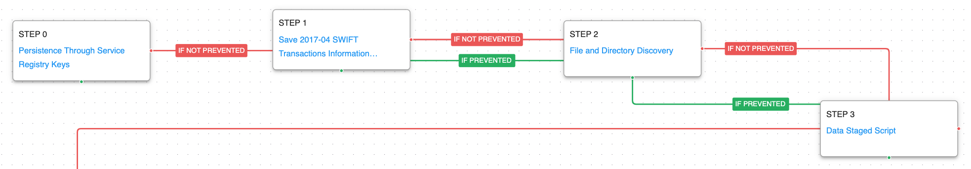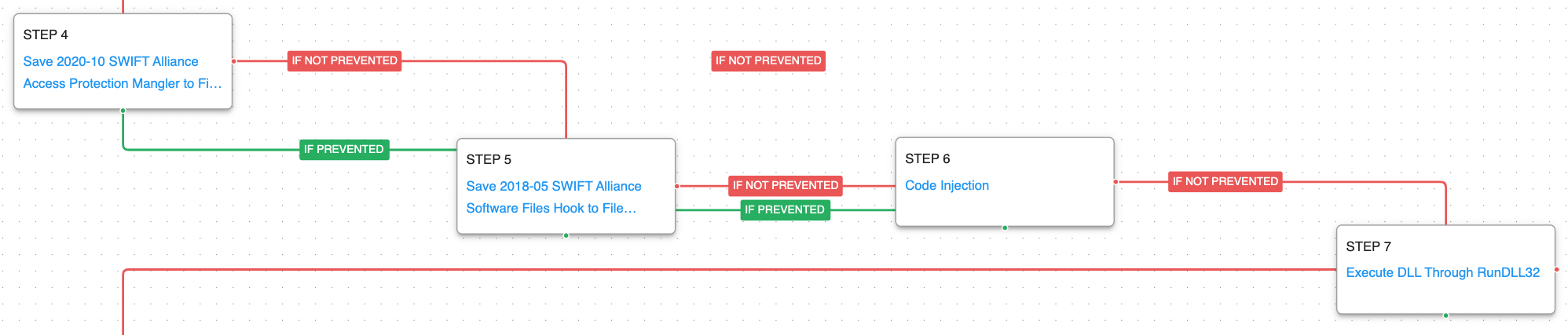 The first attack graph covers a set of attacks first identified by Kaspersky in a February 2017 report that detailed the attacks against the SWIFT systems of a bank in Southeast Asia in August 2016 and an unknown bank in Europe in January 2017.