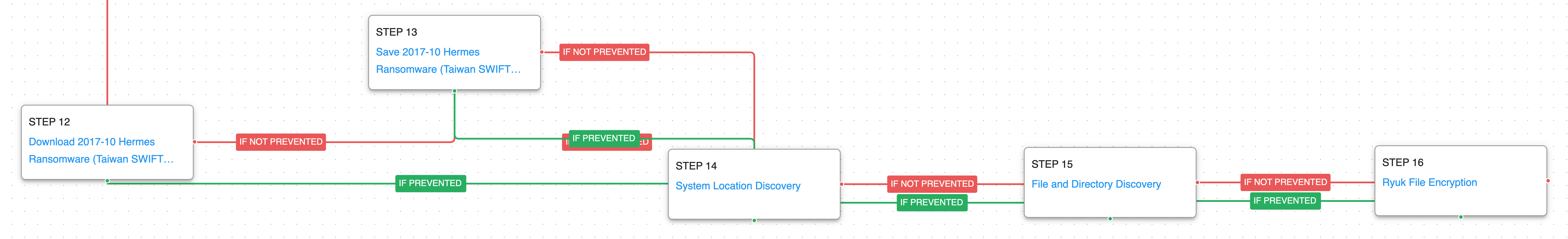 The final steps in this attack graph download the actor’s final payload, the Hermes Ransomware, which was used as part of their false flag operations to obscure the financial theft.