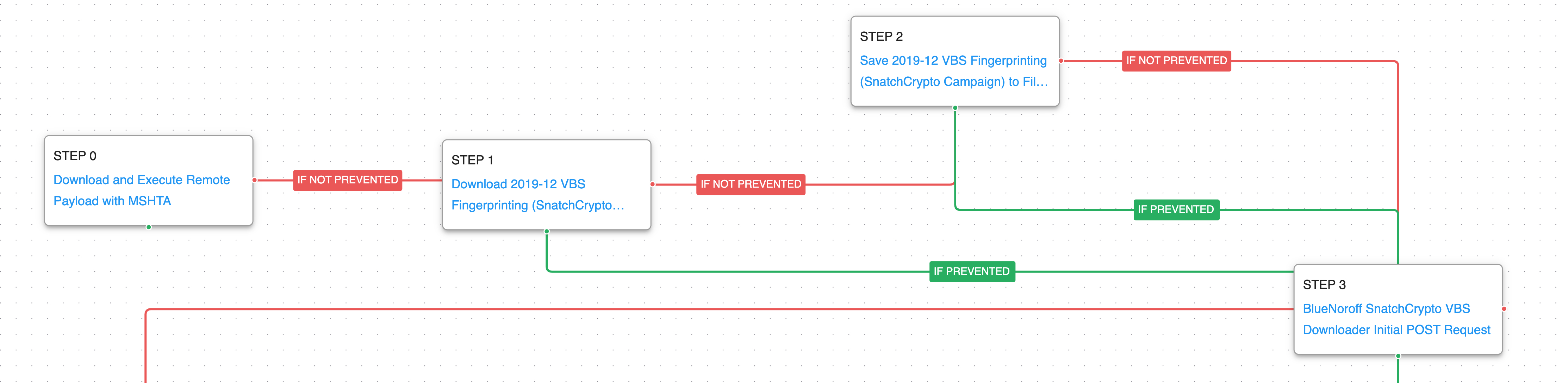 The final attack graph starts with the execution of MSHTA that downloads and executes a remote payload containing VBScript code. This code is responsible for making the initial command and control request to the actor’s infrastructure.