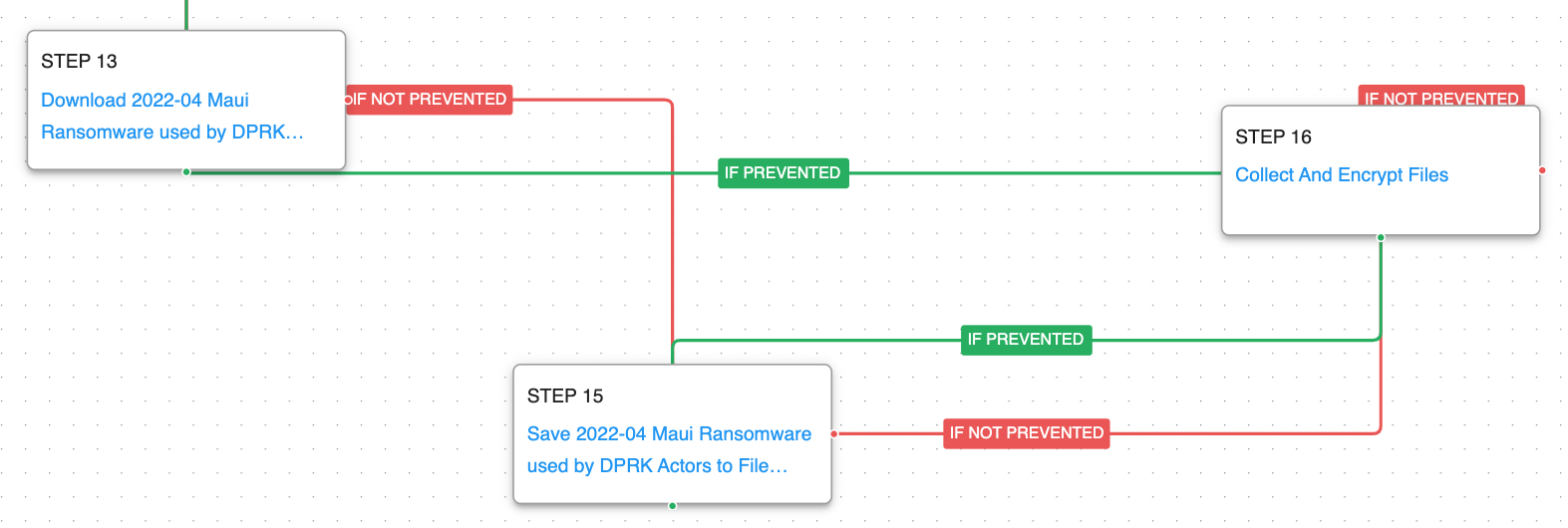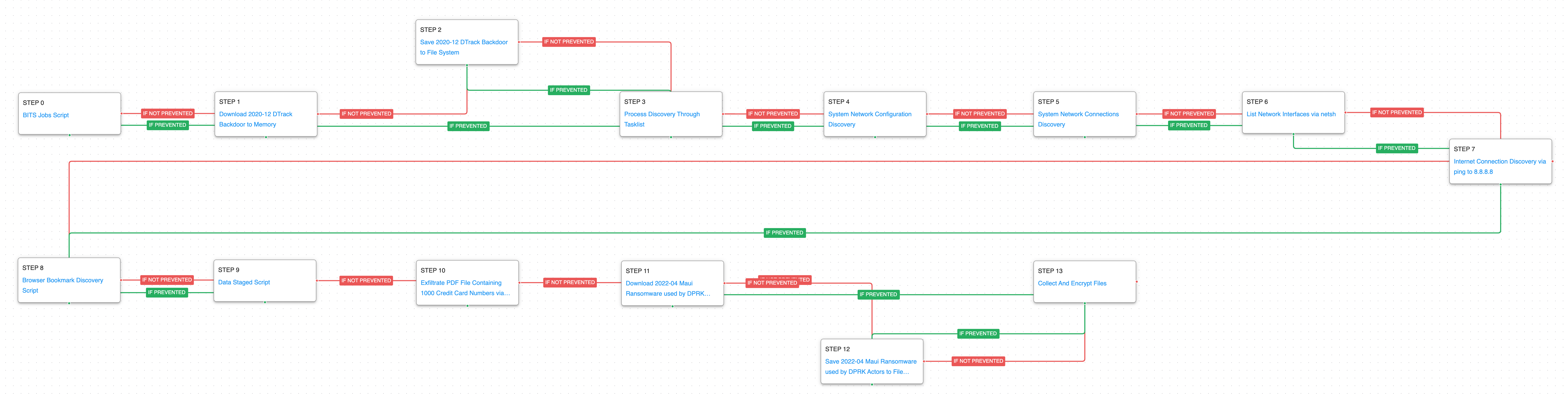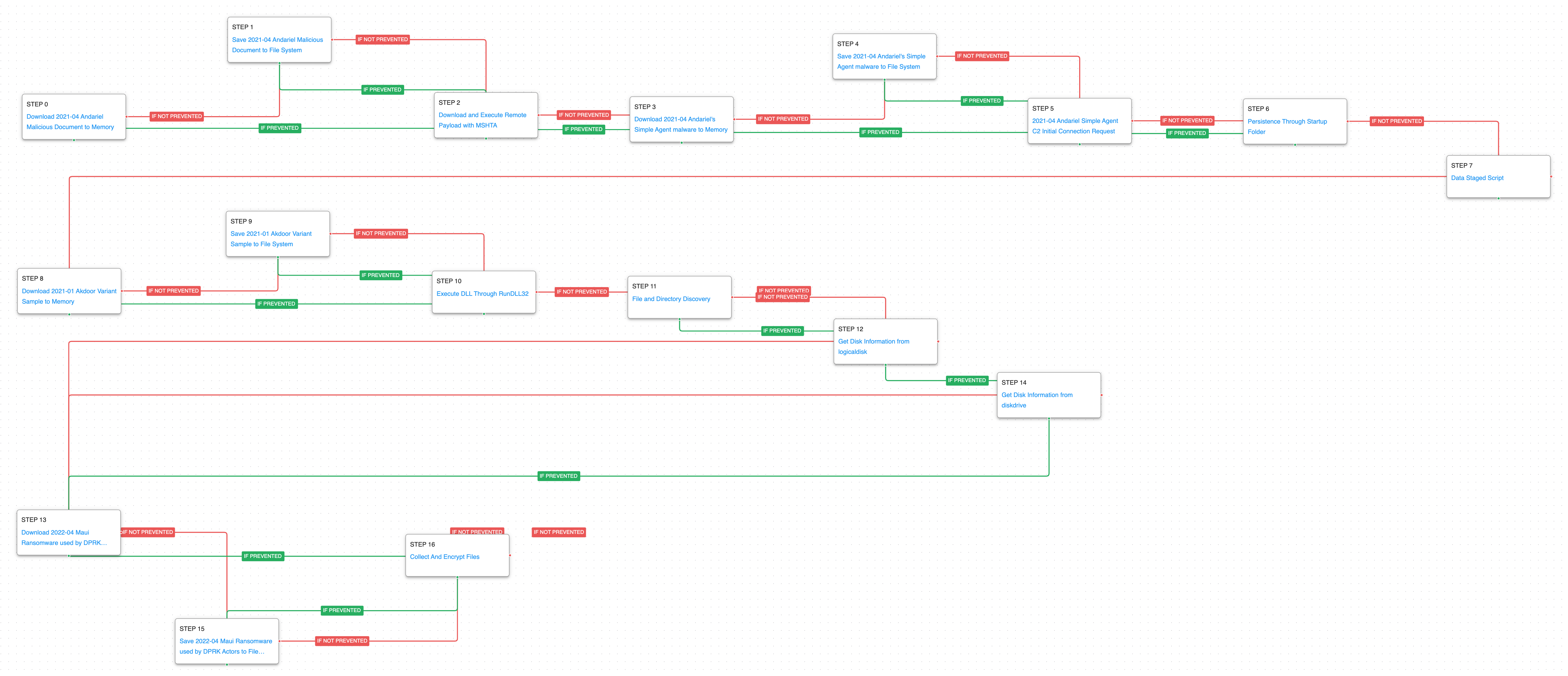 The second attack graph details a Kaspersky report which is a response to the US-CERT Alert AA22-187A “North Korean State-Sponsored Cyber Actors Use Maui Ransomware to Target the Healthcare and Public Health Sector”. During these attacks, Andariel deployed their DTrack malware and the Maui ransomware against targets located primarily in Japan, India, Russia, and Vietnam.