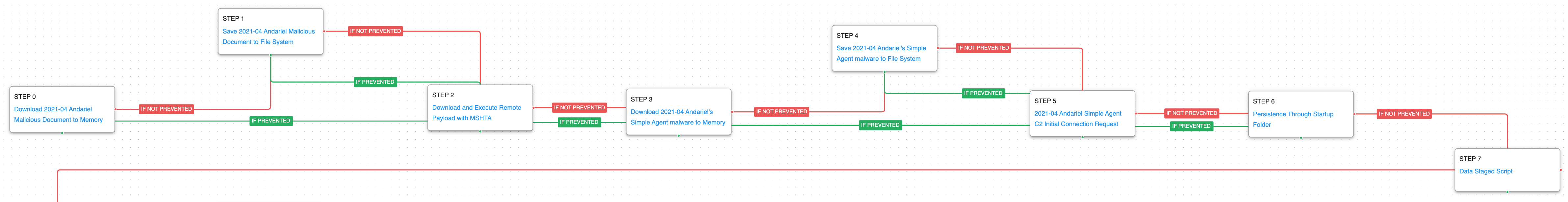 This first attack graph describes a multi-stage campaign against South Korea reported by SecureList and MalwareBytes in April 2021, culminating in the deployment of custom ransomware.
