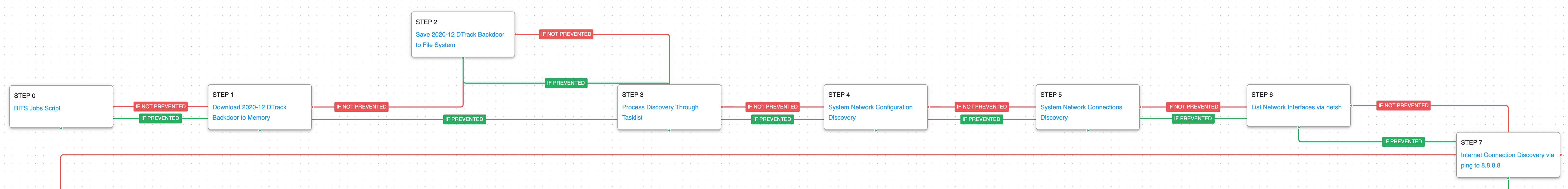 The attack graph starts with a BITS Jobs, which is used for downloading and executing the DTrack malware. Next, the attack graph will seek to emulate the information discovery phase of the attack focused on the collection of running process, system networking configuration.