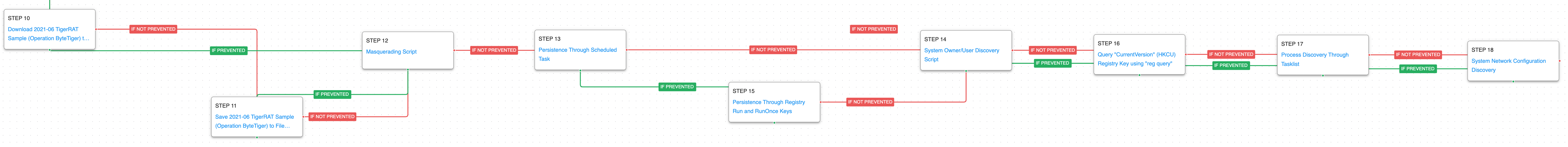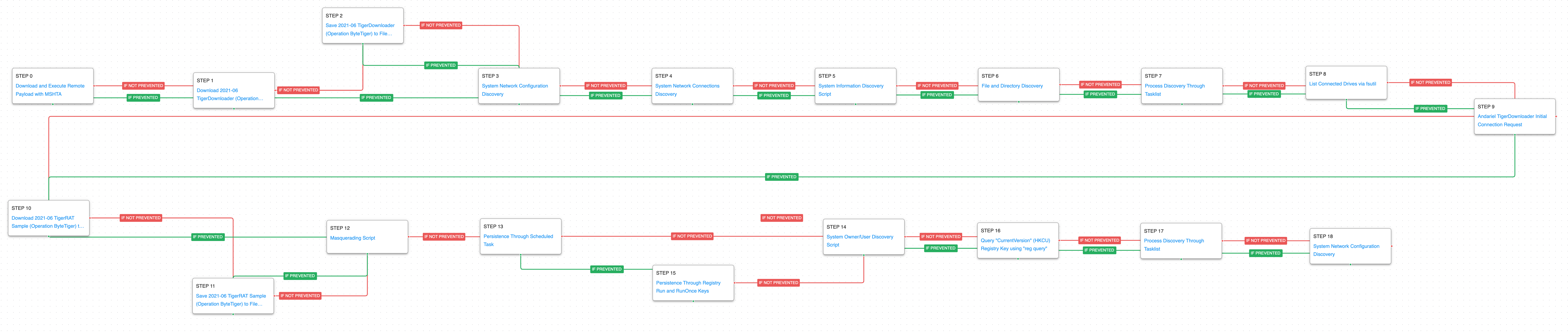 The last attack graph is based on the Operation ByteTiger report by the Korean CERT (KrCERT) in September 2021, which is based on a series of attacks against South Korean entities using two pieces of malware named TigerDownloader and TigerRAT.
