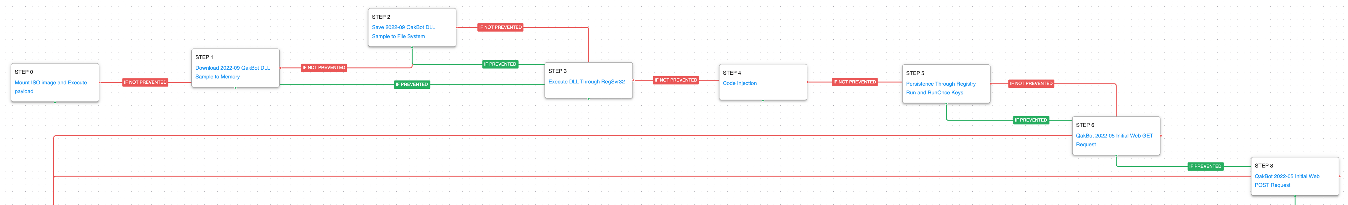 This emulation begins with the mounting of an ISO image and the subsequent execution of its payload, which culminates with the download and saving of the DLL associated with QakBot. This DLL is executed through RegSvr32 and injected into a process. Subsequently, the emulation attempts to obtain persistence through the registry and emulates communications between the malware and the adversary’s infrastructure.