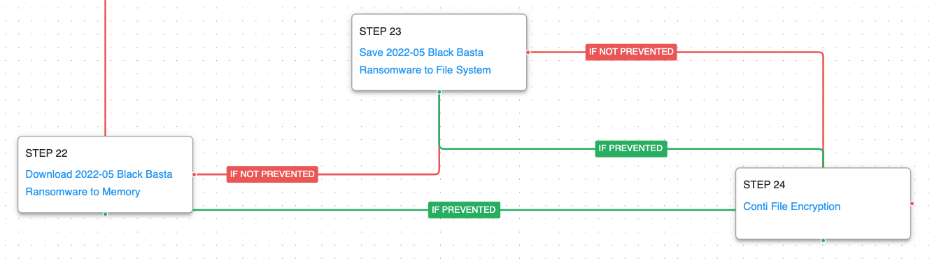 The second attack graph is based on another TrendMicro report detailing the emerging Black Basta ransomware group using the QakBot for initial access and lateral movement, while taking advantage of the PrintNightmare vulnerability (CVE-2021-34527) to perform privileged file operations. During this activity, the attacker distributed QakBot using spearphishing emails containing Excel 4.0 files with macros.
