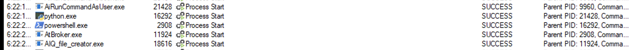 ai_exec_server.exe → AiRunCommandAsUser.exe (if running under user privileges) → python.exe → powershell.exe → atbroker.exe → AIQ_file_creator.exe