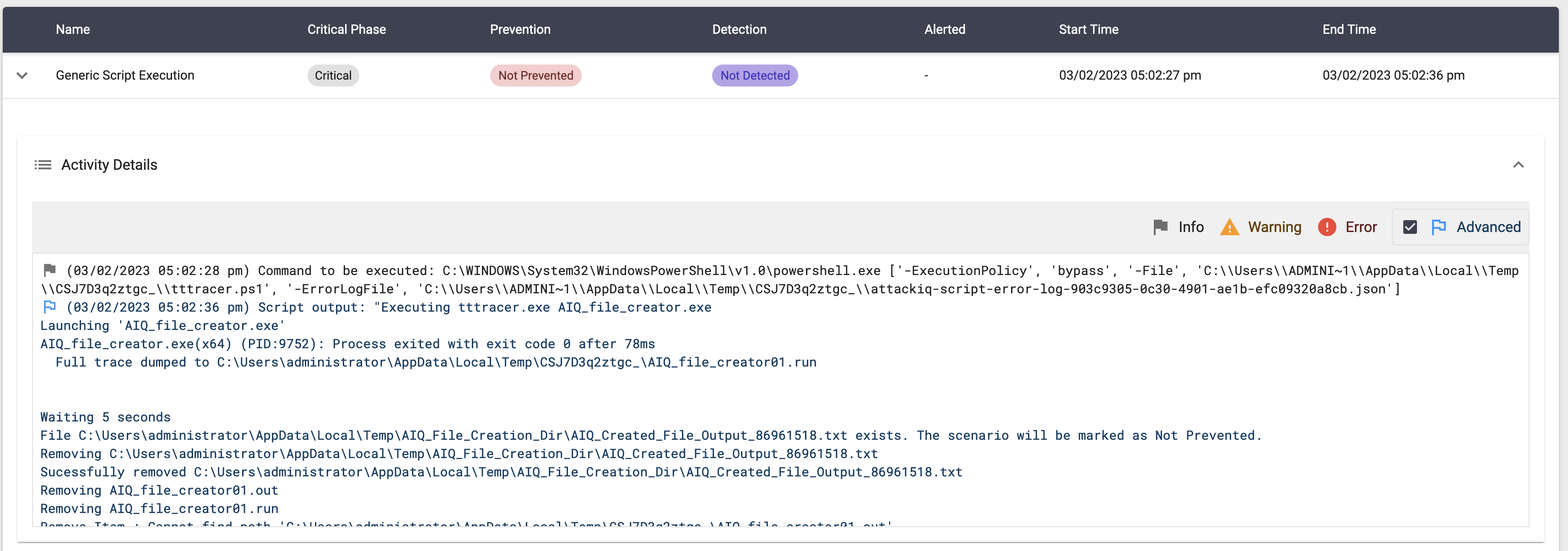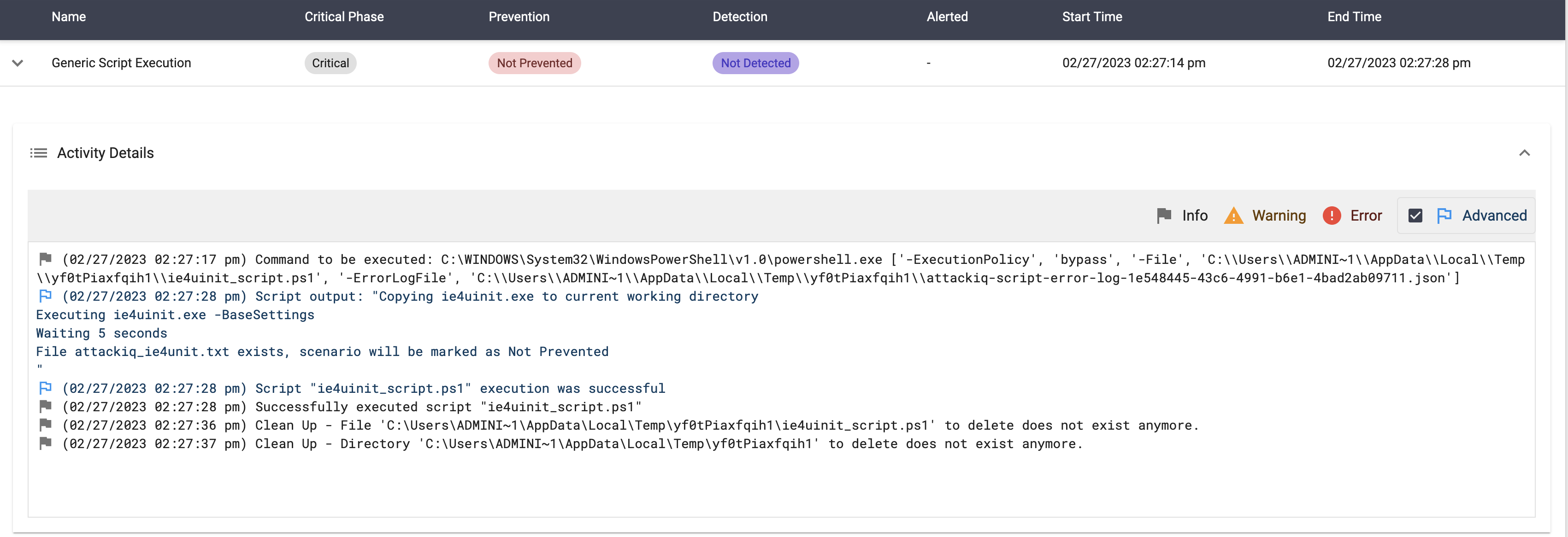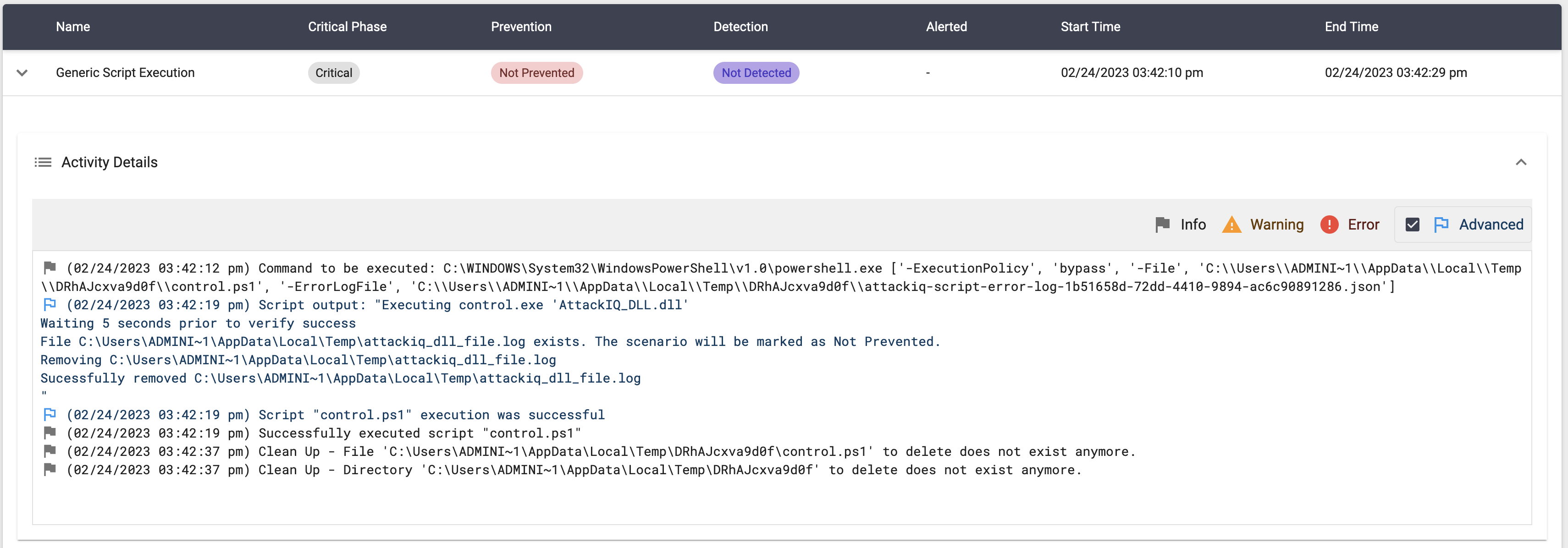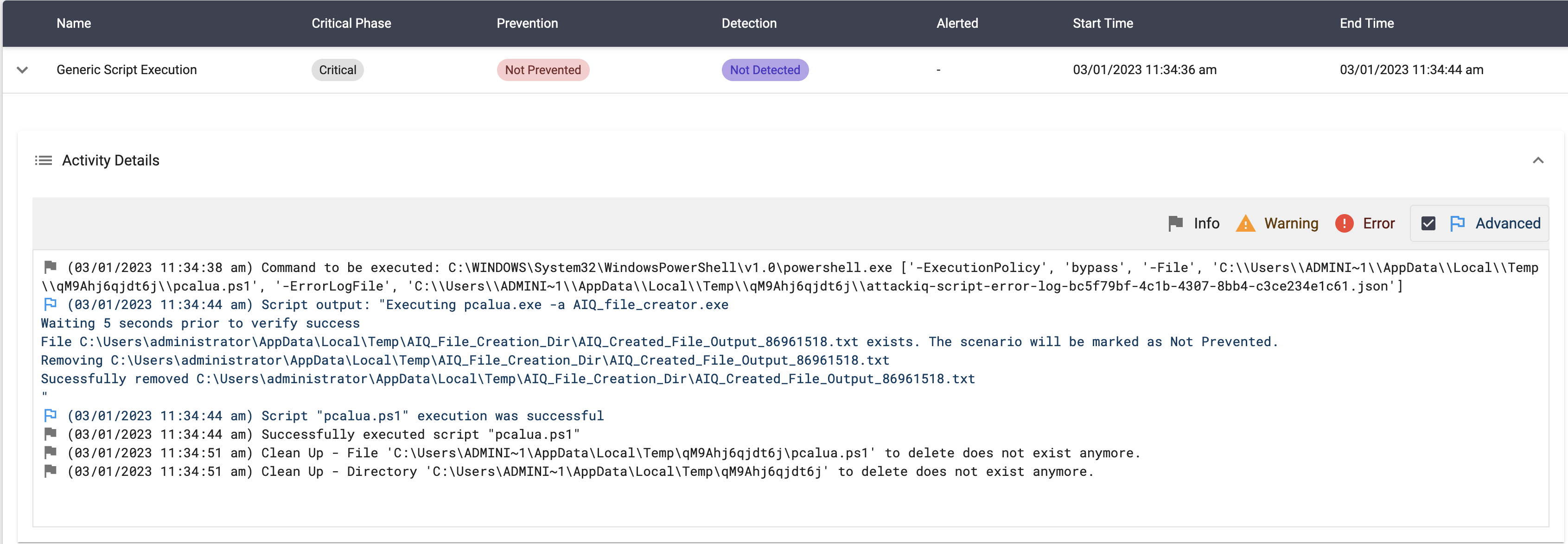 The scenario will be marked as Not Prevented if the file exists en the temp folder.