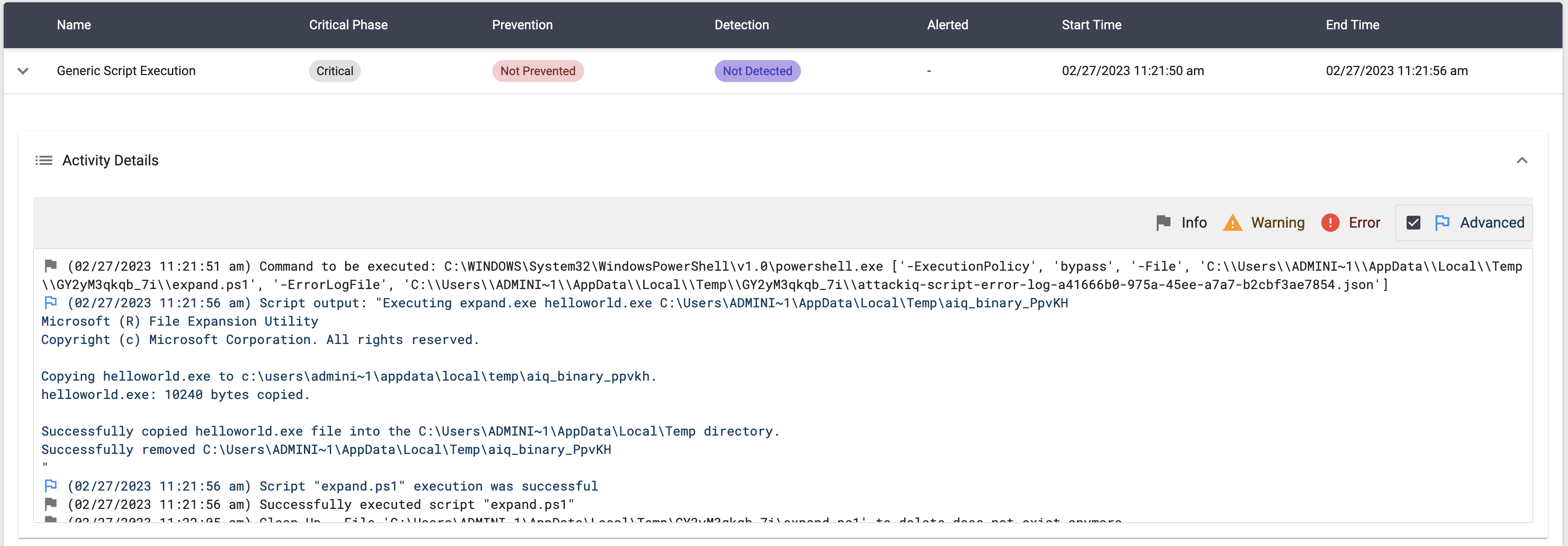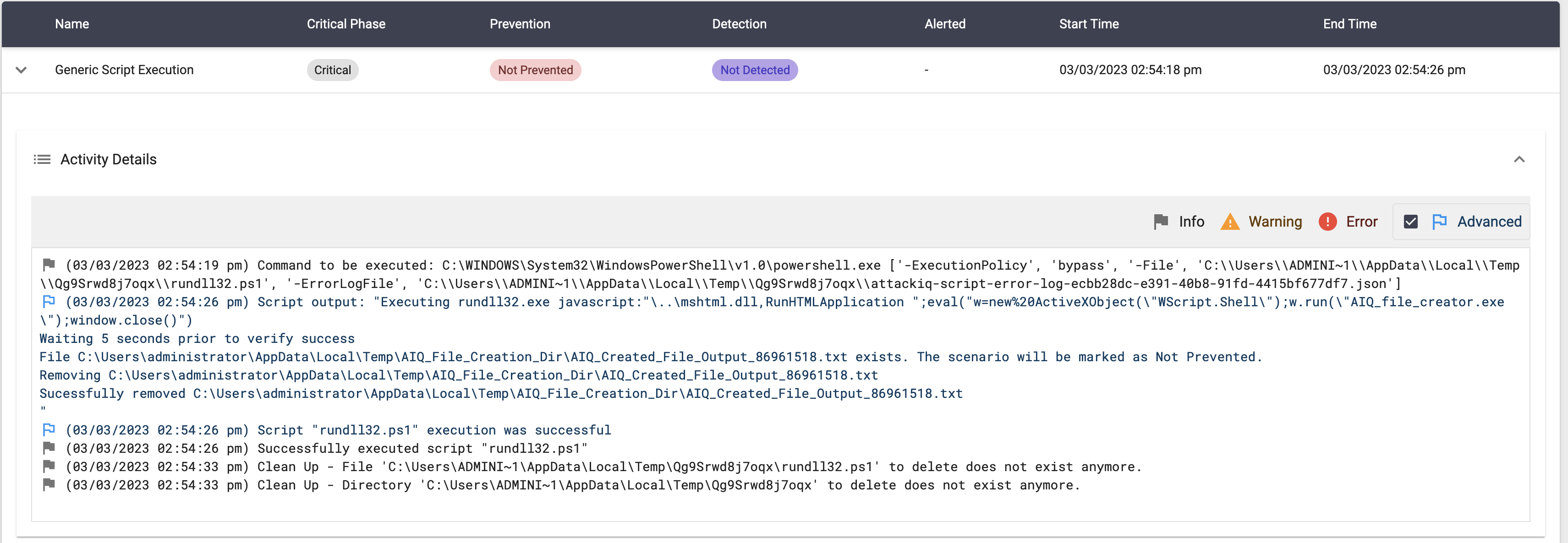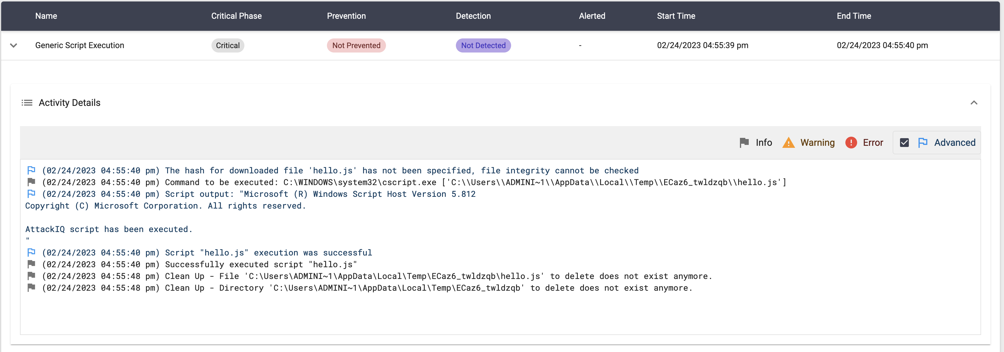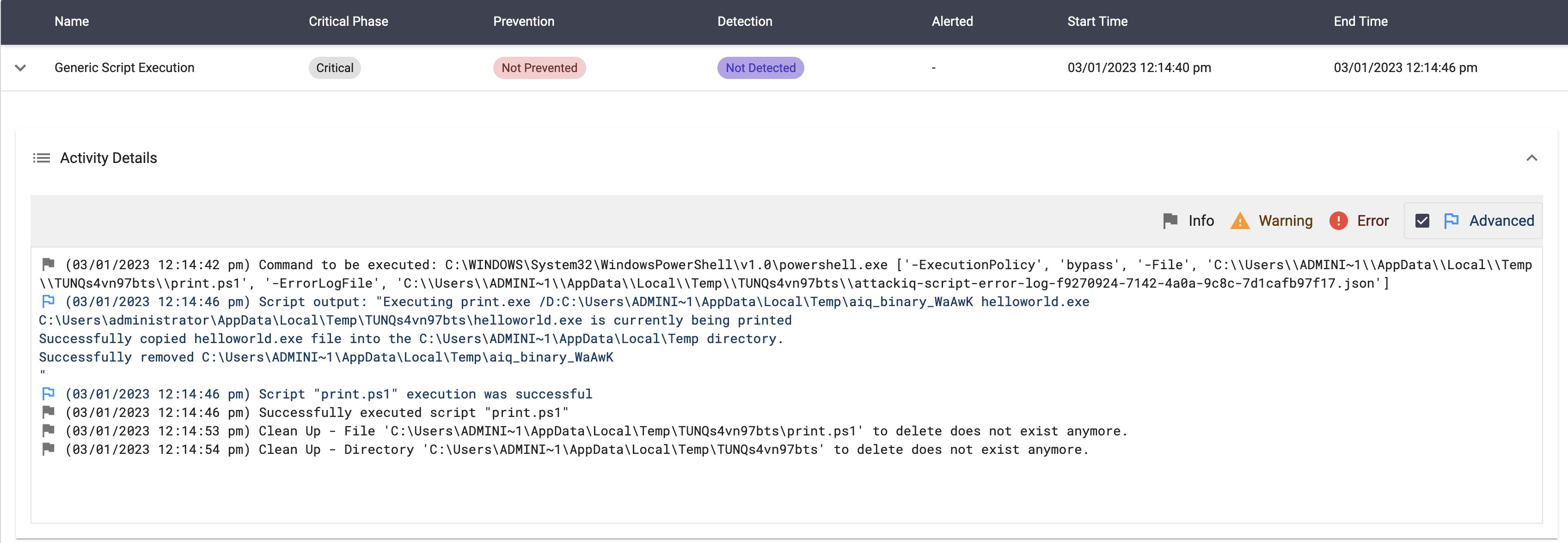 The scenario will be marked as Not Prevented if the file exists en the temp folder.