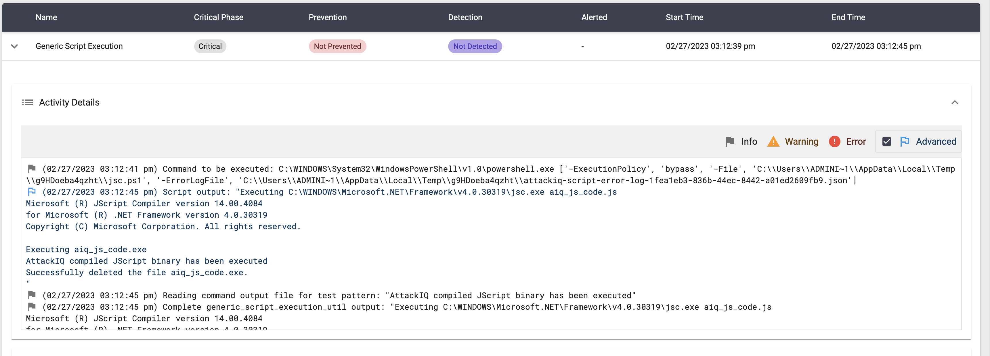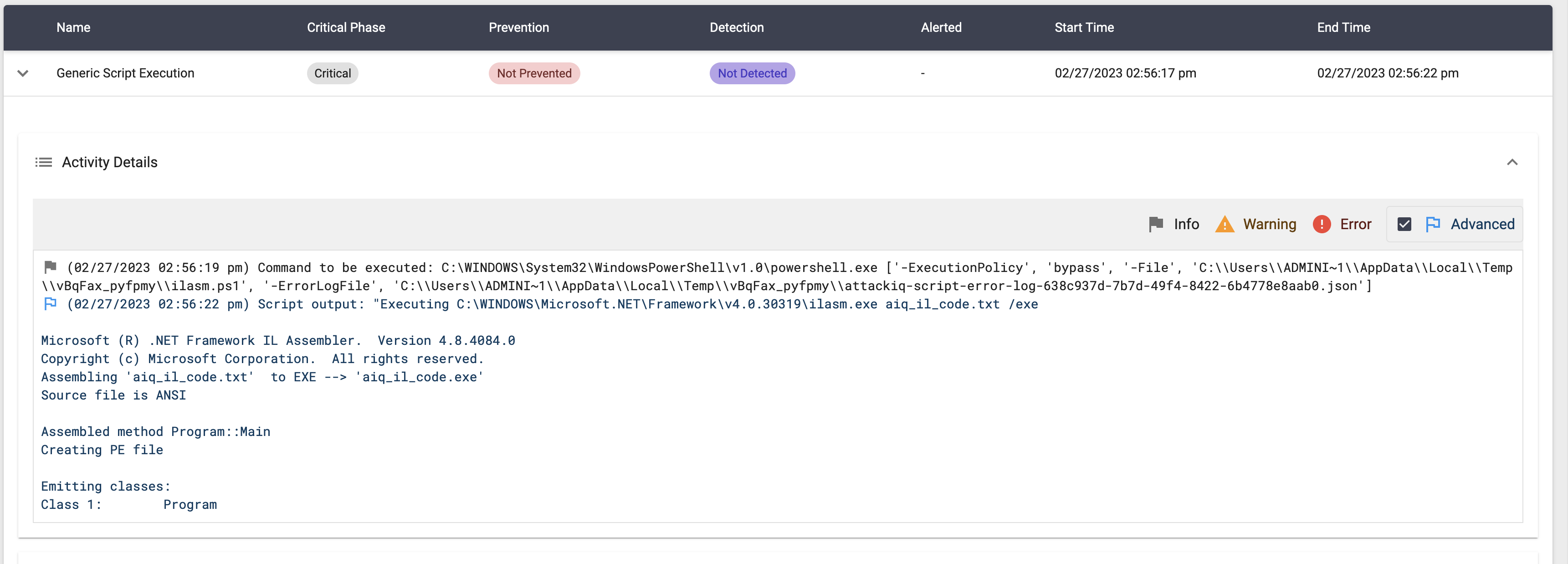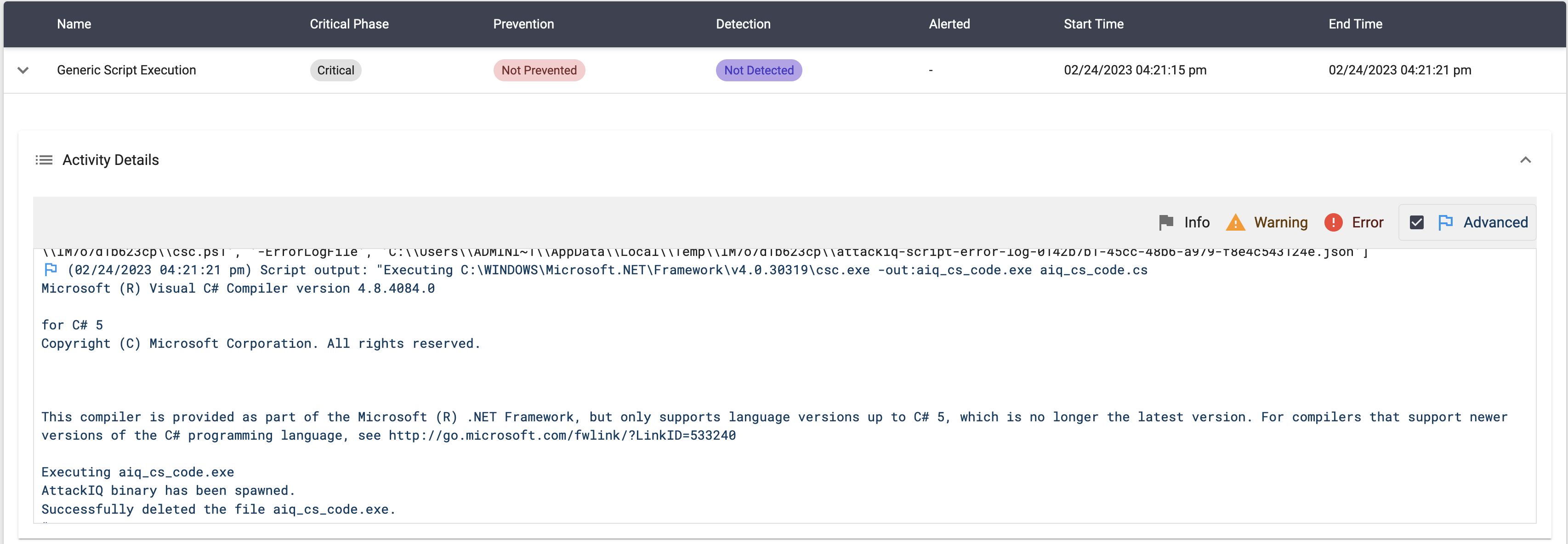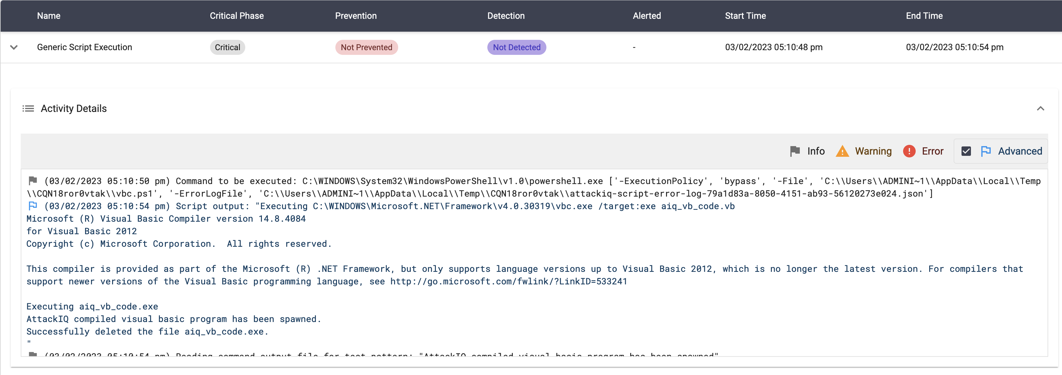 The scenario will be marked as Not Prevented if the message “AttackIQ compiled visual basic program has been spawned” is present in the stdout of the compiled binary execution.