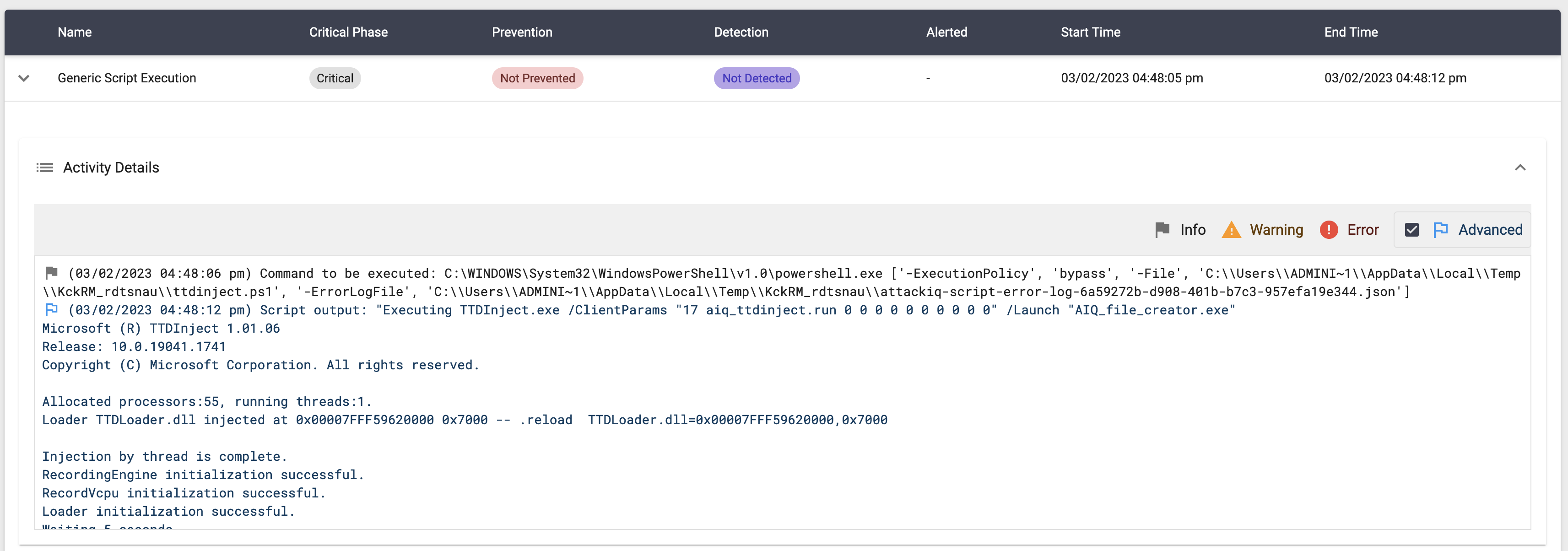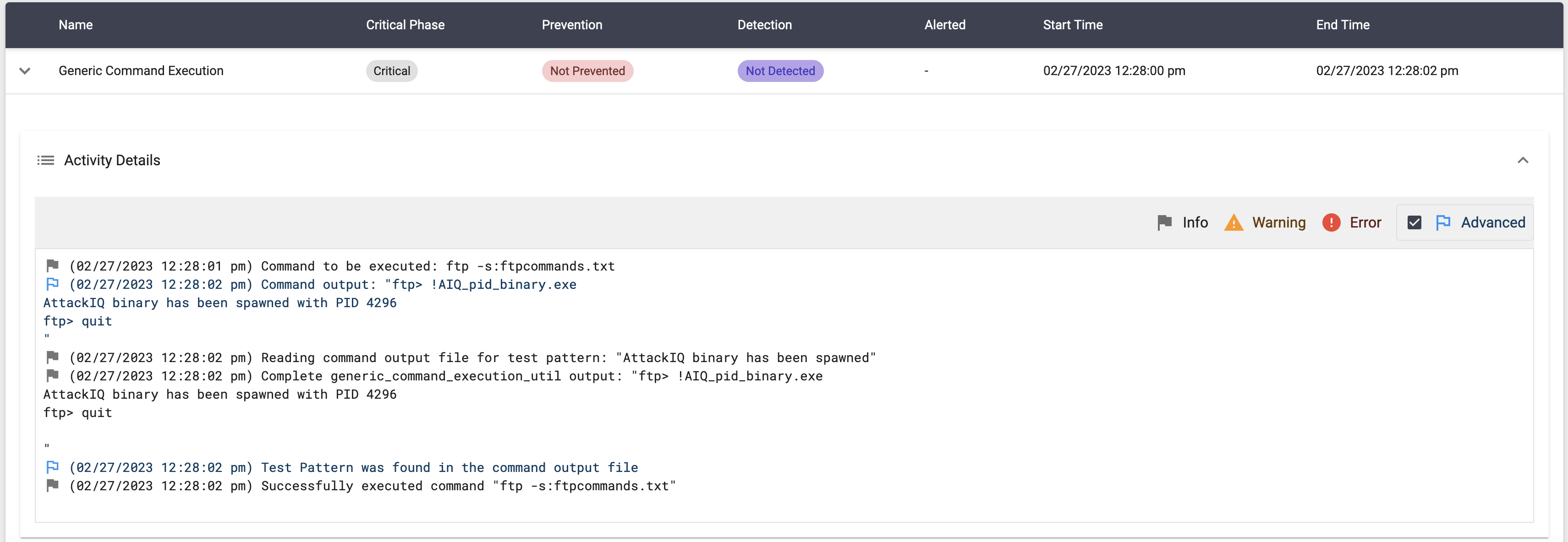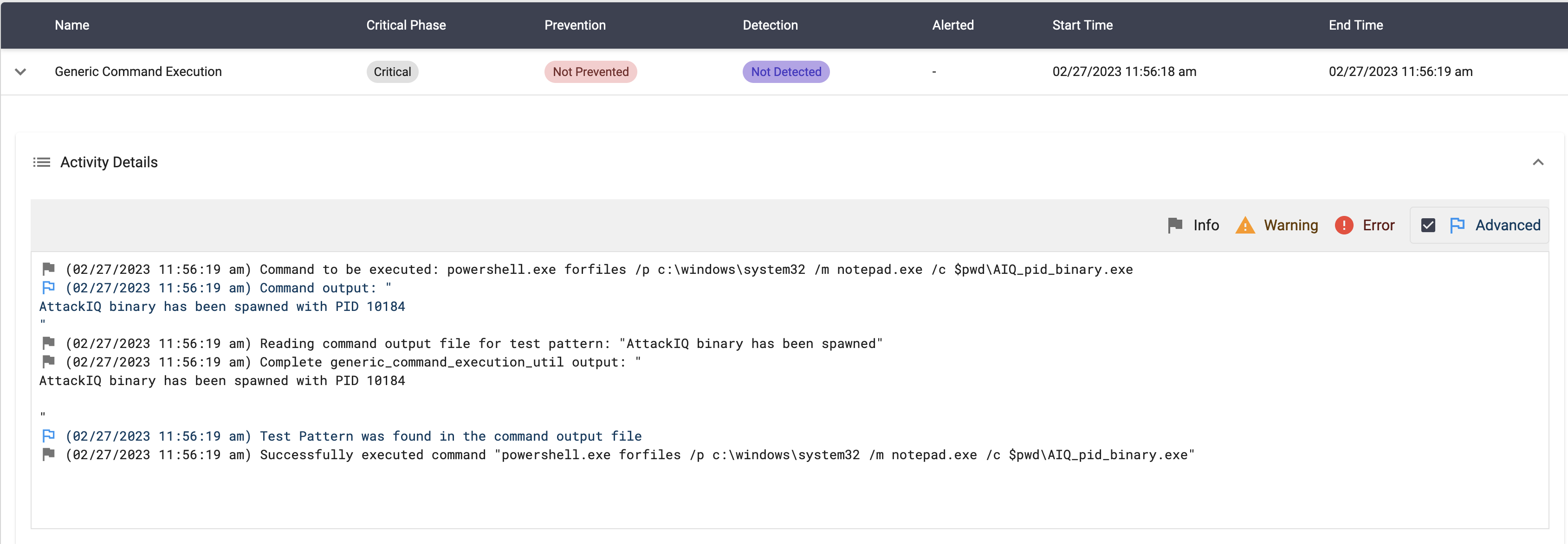 The scenario will be marked as Not Prevented if the message “AttackIQ binary has been spawned” is present in the stdout of the compiled binary execution.