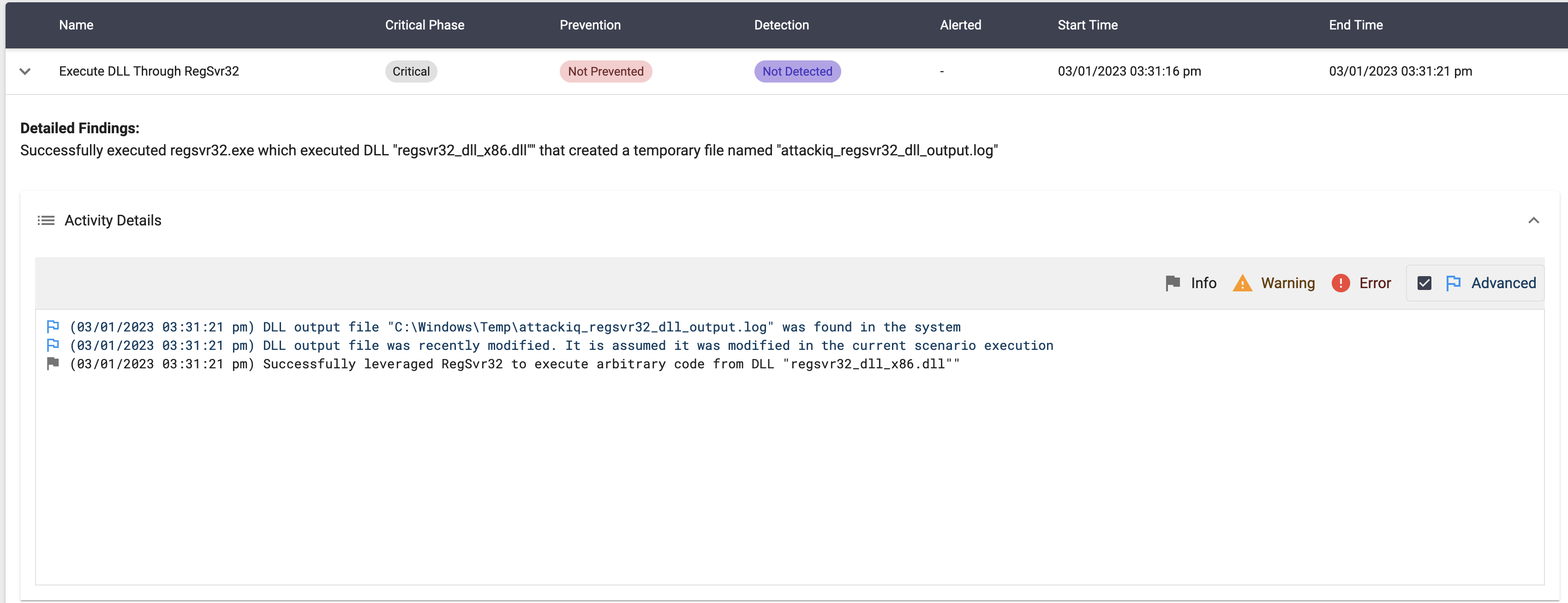 The DLL will create a file in the temporary directory when loaded. The scenario will be marked as Not Prevent if the file exists.