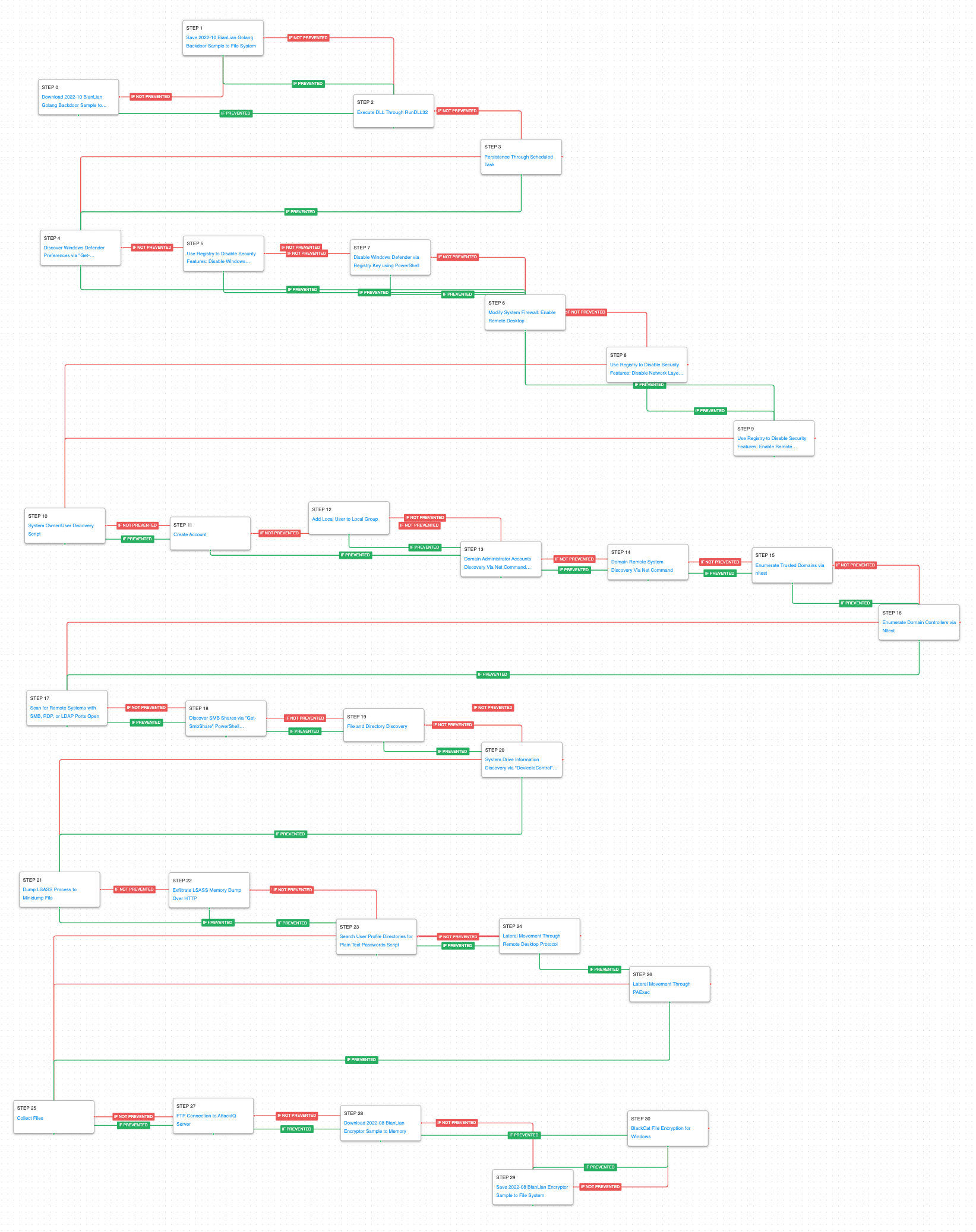 This attack graph emulates a full kill chain attack from the BianLian adversary, that both exfiltrates data and attempts to encrypt sensitive files. This activity leverages a custom backdoor, tailored to each victim and a bespoke encryptor used to encrypt all files, which are accompanied by a ransom note placed in each affected directory.