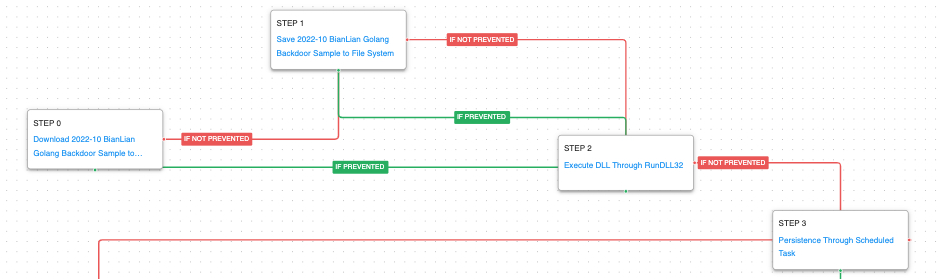The attack graph starts by downloading the custom backdoor and executing it using Window’s native RunDll32 utility. Persistence is established by creating a Scheduled Task using a name attempting to blend in with legitimate tasks.