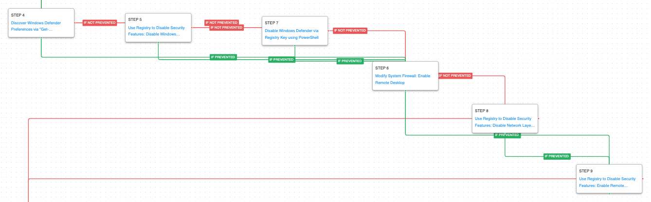 Next, the attack graph will carry out defense evasion tasks, such as disabling security tools and modifying system firewall policies. The end goal of this stage is to then attempt to enable some remote graphical access to the system by either allowing Remote Desktop or Remote Assistance.
