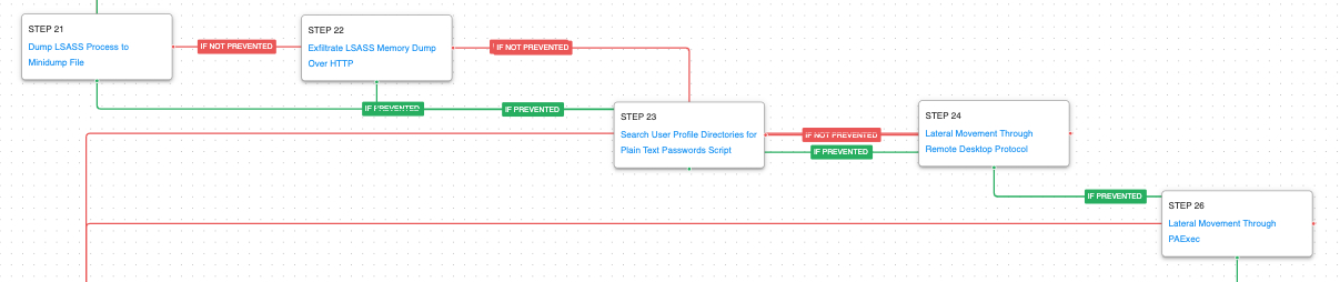 To facilitate lateral movement, the attack graph will dump and exfiltrate LSASS memory and search files for plain text credentials. Attempts to move laterally to other systems will be completed by using RDP or PAExec.