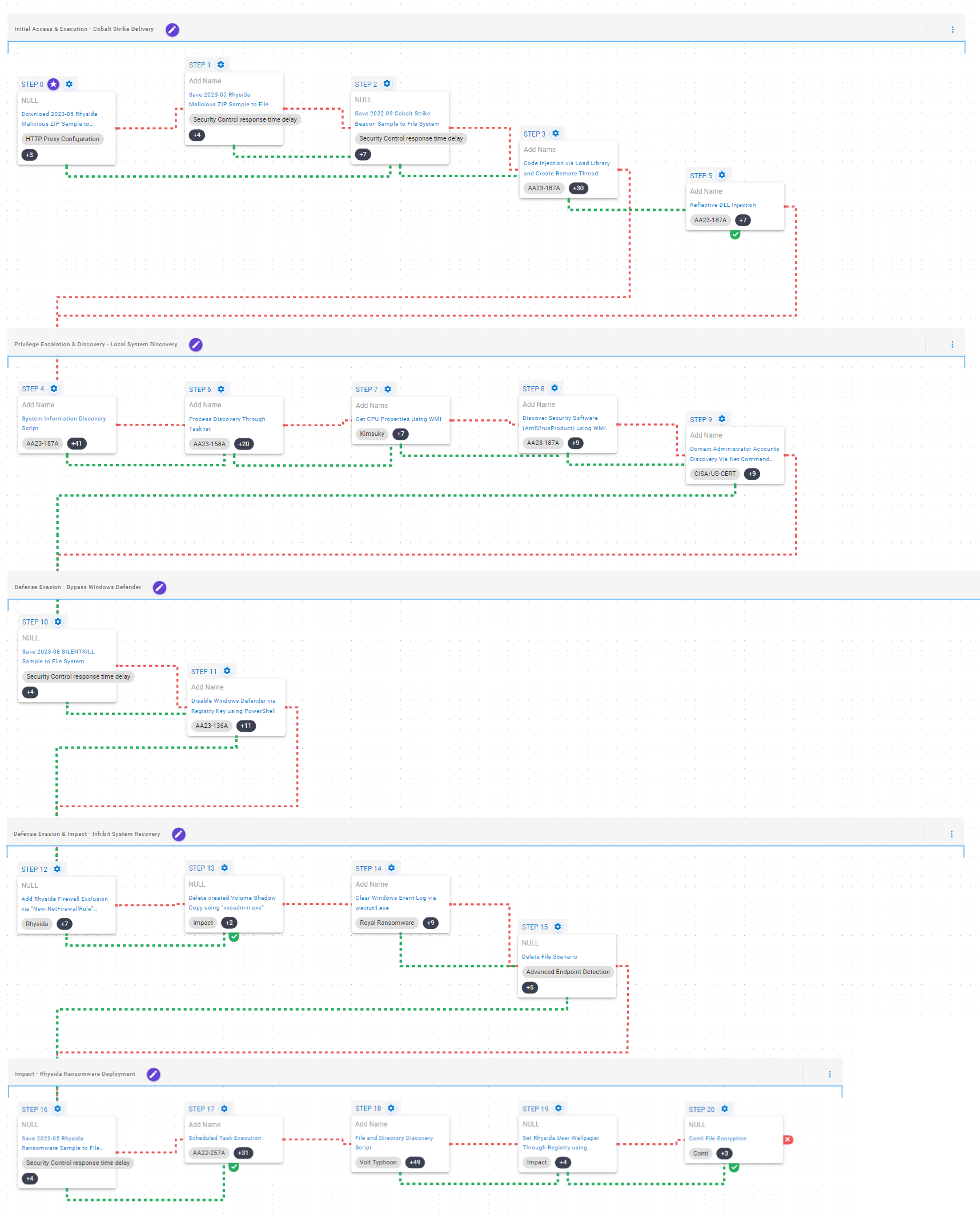 Striving to offer the broadest possible range of intrusion chains on this threat, AttackIQ has created two variants of the emulation that are intended to group together those behaviors employed by Rhysida in different periods of activity.