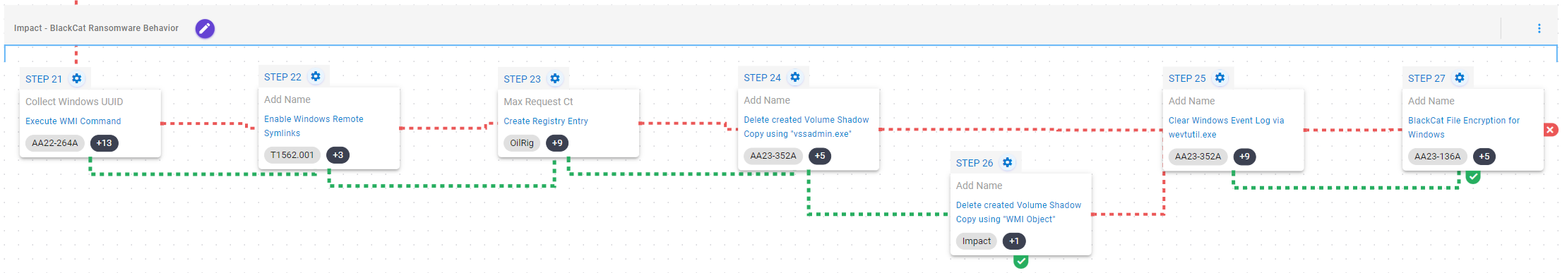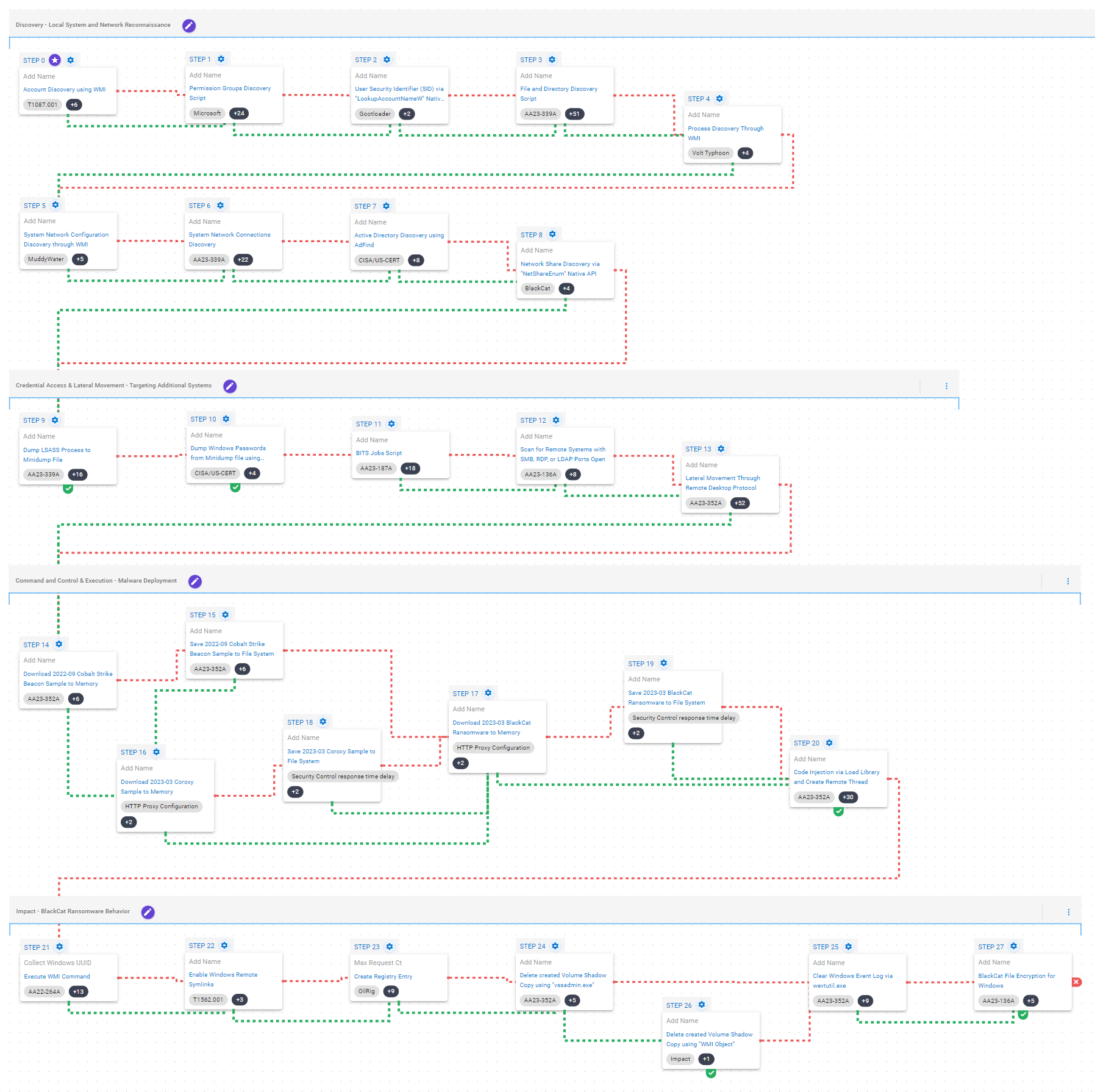 This attack graph emulates the different Tactics, Techniques, and Procedures (TTPs) observed in multiple activities associated with BlackCat Ransomware.