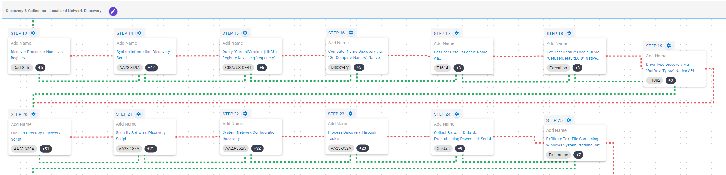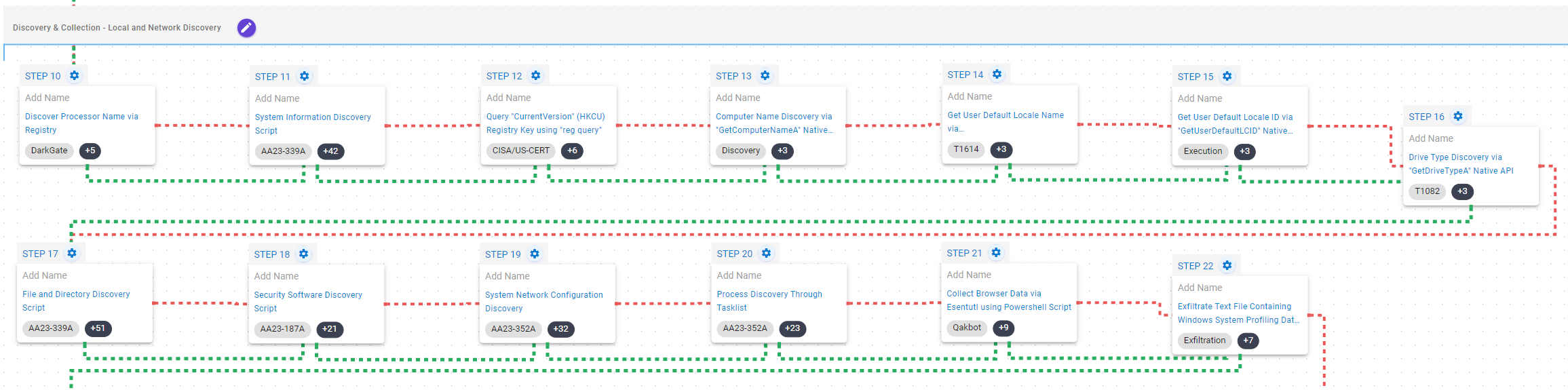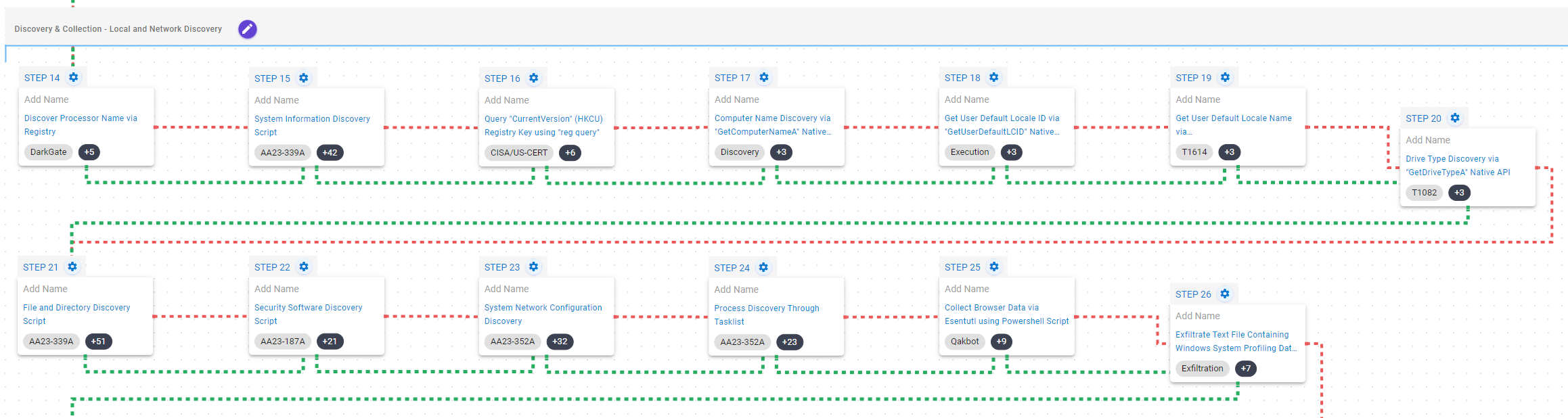 This stage focuses on the discovery of information related to the local environment of the compromised system. During these activities, the adversary acquires information about the system, its hardware, its location, available files and directories, security software, running processes and network configuration.