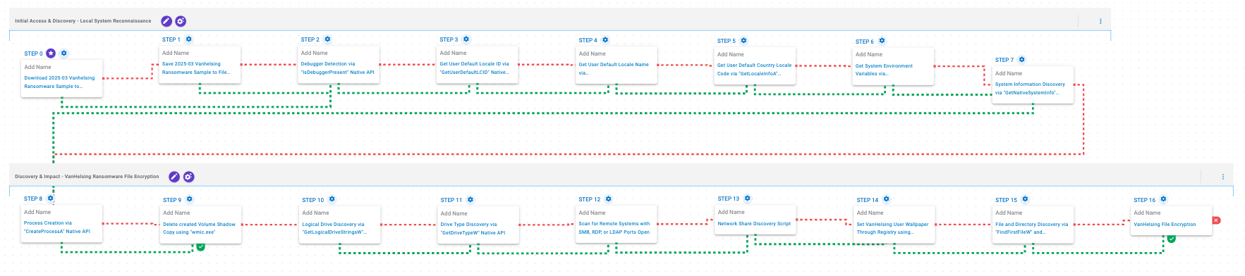 Data Encrypted for Impact (T1486): This scenario performs the file encryption routines used by common ransomware families. Files matching an extension list are identified and encrypted in place using similar encryption algorithms as used by VanHelsing ransomware.