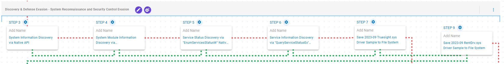 System Service Discovery (T1007): This scenario executes the QueryServiceStatusEx and EnumDependentServices Windows API calls to retrieve information pertaining to a given service.