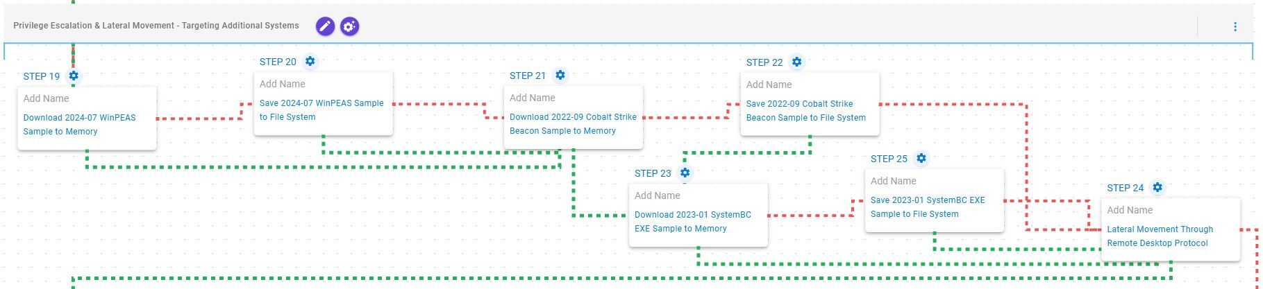 This stage begins with the deployment of the Windows Privilege Escalation Awesome Scripts (WinPEAS) tool, used to escalate privileges on the compromised system. Following this, a Cobalt Strike beacon is deployed to establish communication with the Command and Control (C2) server. In case of failure, the emulation falls back on deploying the SystemBC backdoor as an alternative C2 channel.